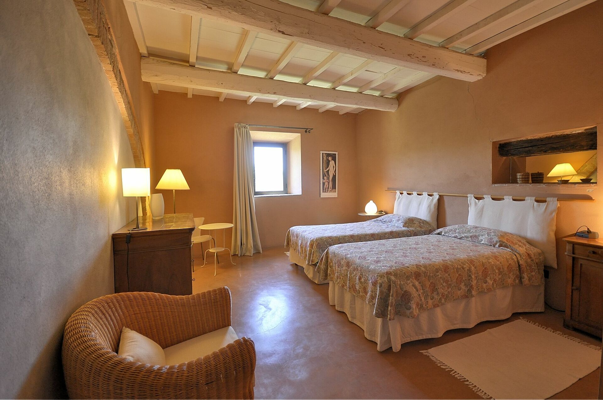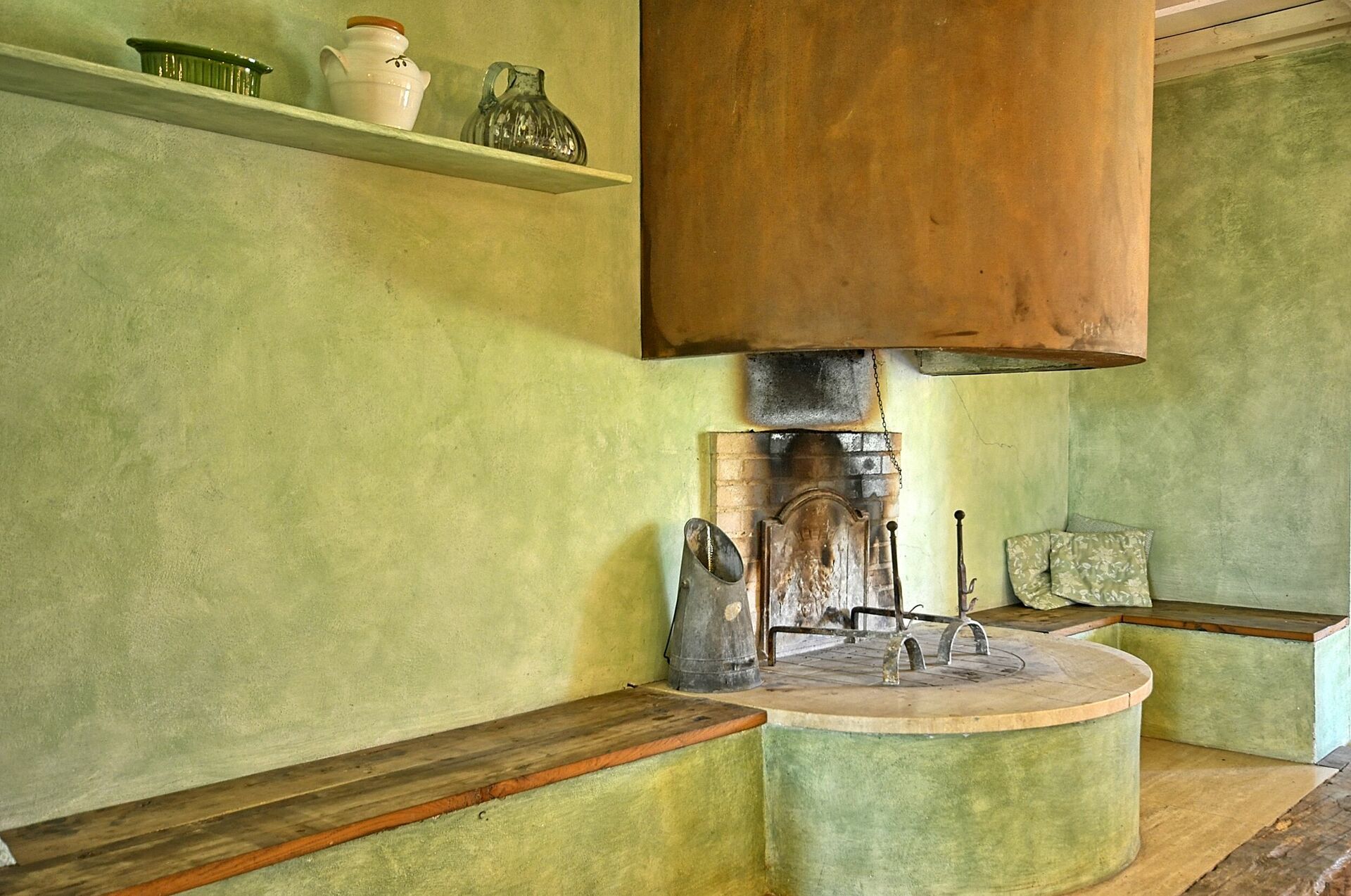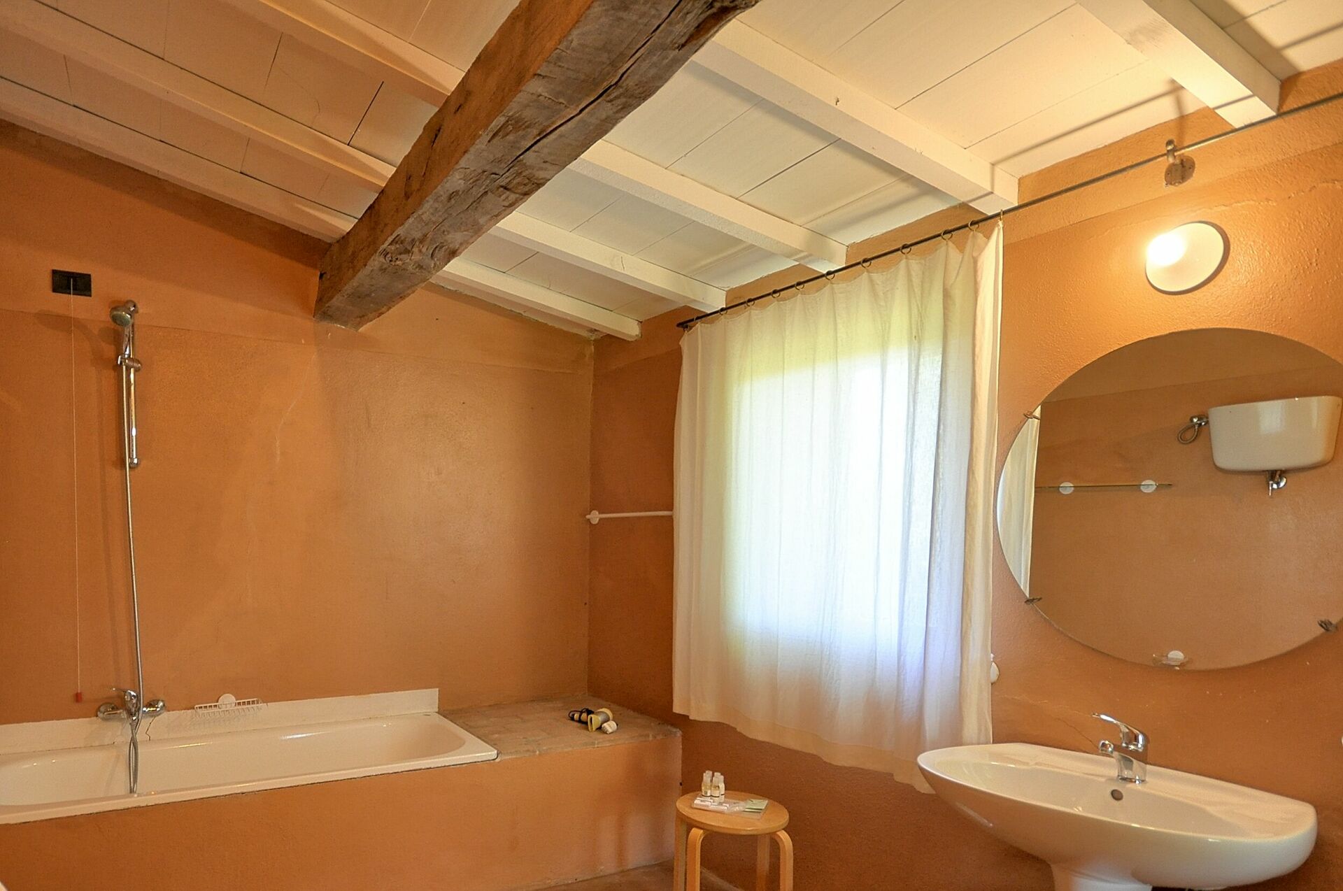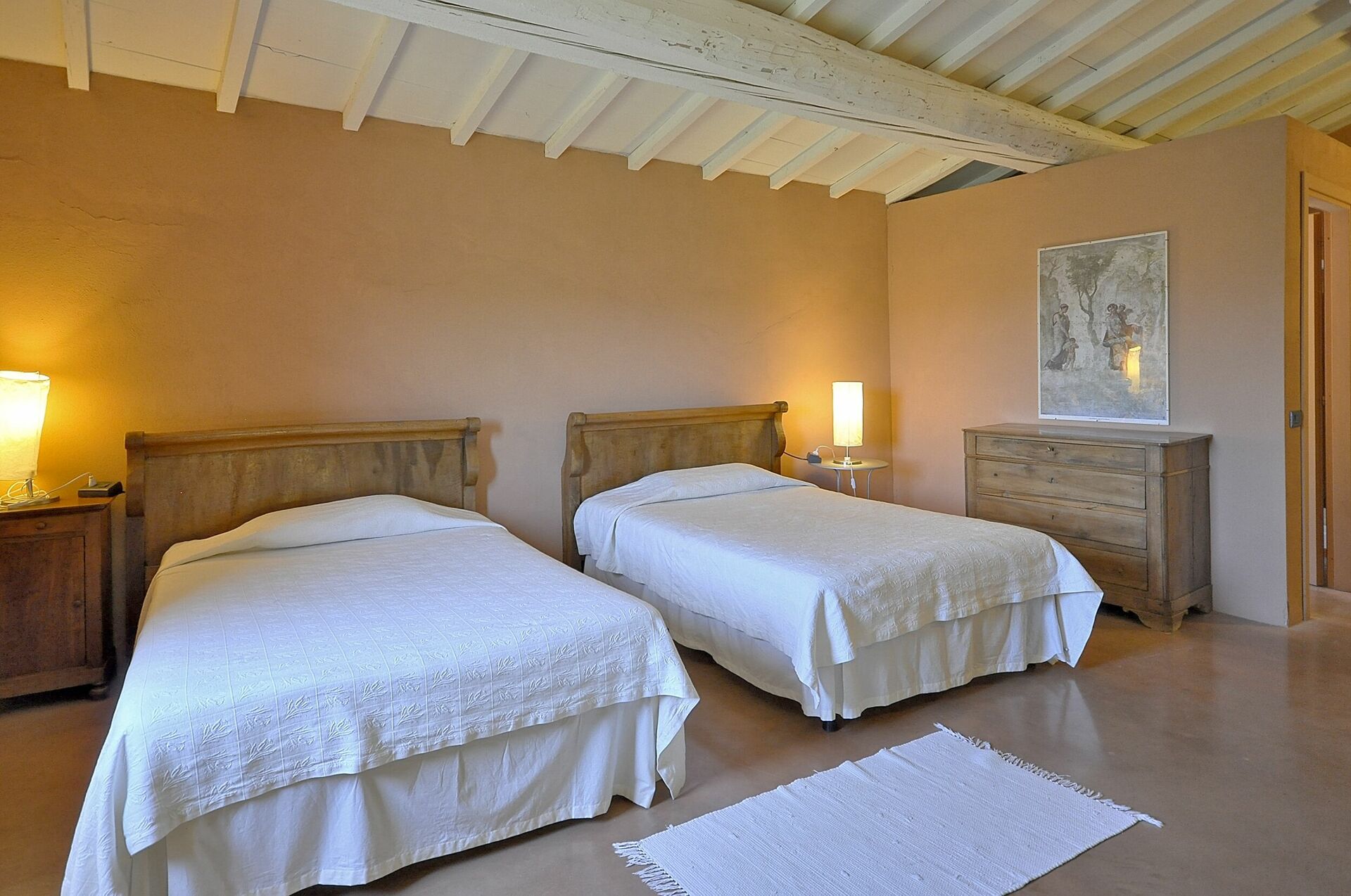 Ground Floor: entrance leads into a large open space which includes living area with sofas and armchairs, spacious dining area with wood table just in front of an ancient working fireplace, kitchen fully equipped with gas stove (4 burns) electric oven, microwave, coffee machine, toaster, dishwasher, from the kitchen a large French door gives the access to the garden on the pool side. In the same floor there are 3 bedrooms, one with two single beds (joinable upon request) with a private bathroom with shower, second bedroom with two single beds, (joinable) direct access to the garden and a private bathroom with bathtub, third bedroom with two French beds, direct access to the garden and private bathroom with shower.