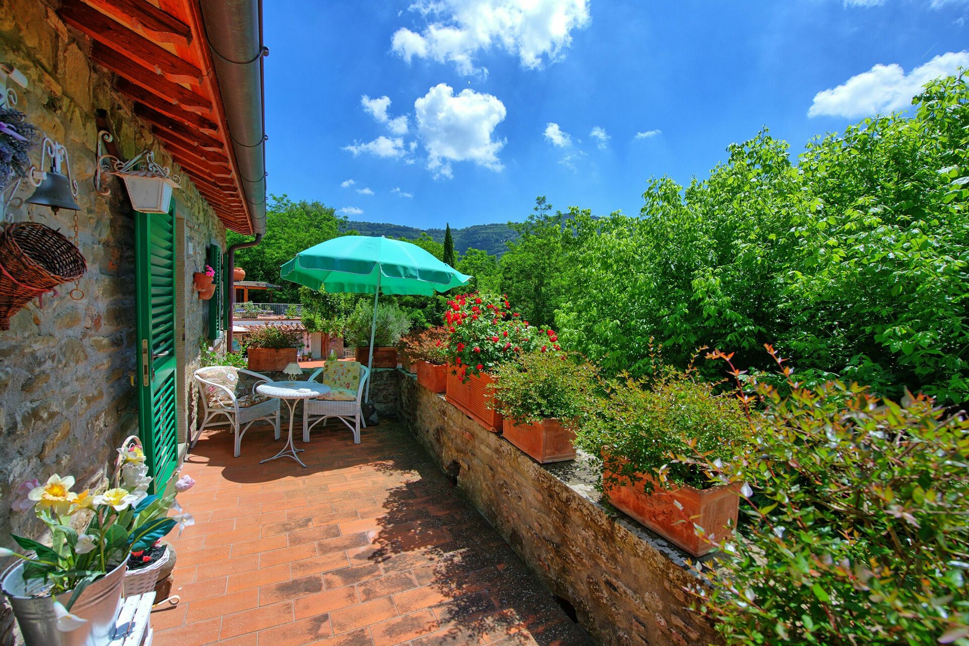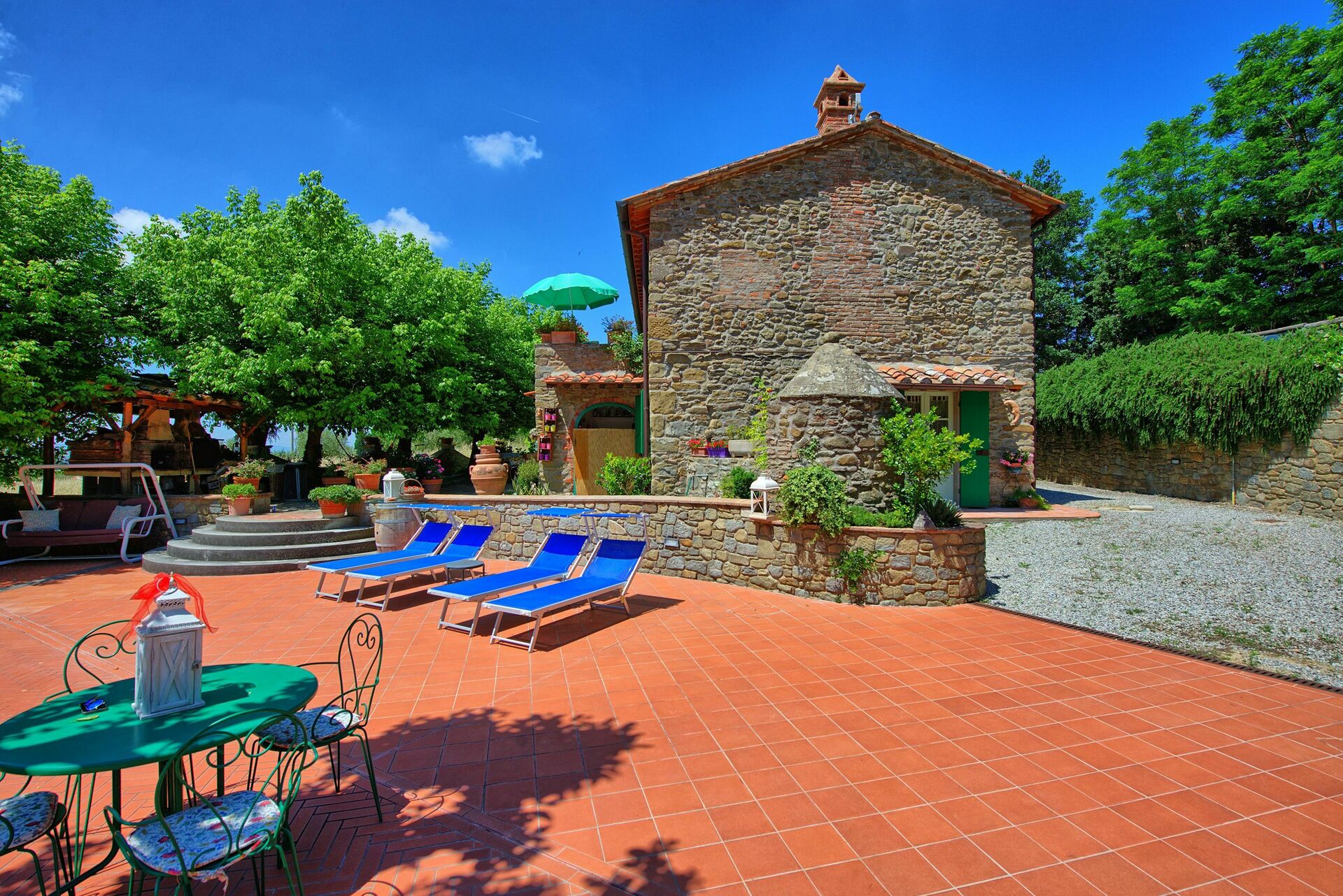 The position of the villa is close to Cortona and the larger cities that both Tuscany and Umbria have to offer: Montepulciano, Siena, Florence, Assisi, Perugia, Montalcino, as well as Lake Trasimeno. Outside guests can enjoy a shaded area with barbecue and woodburing oven.