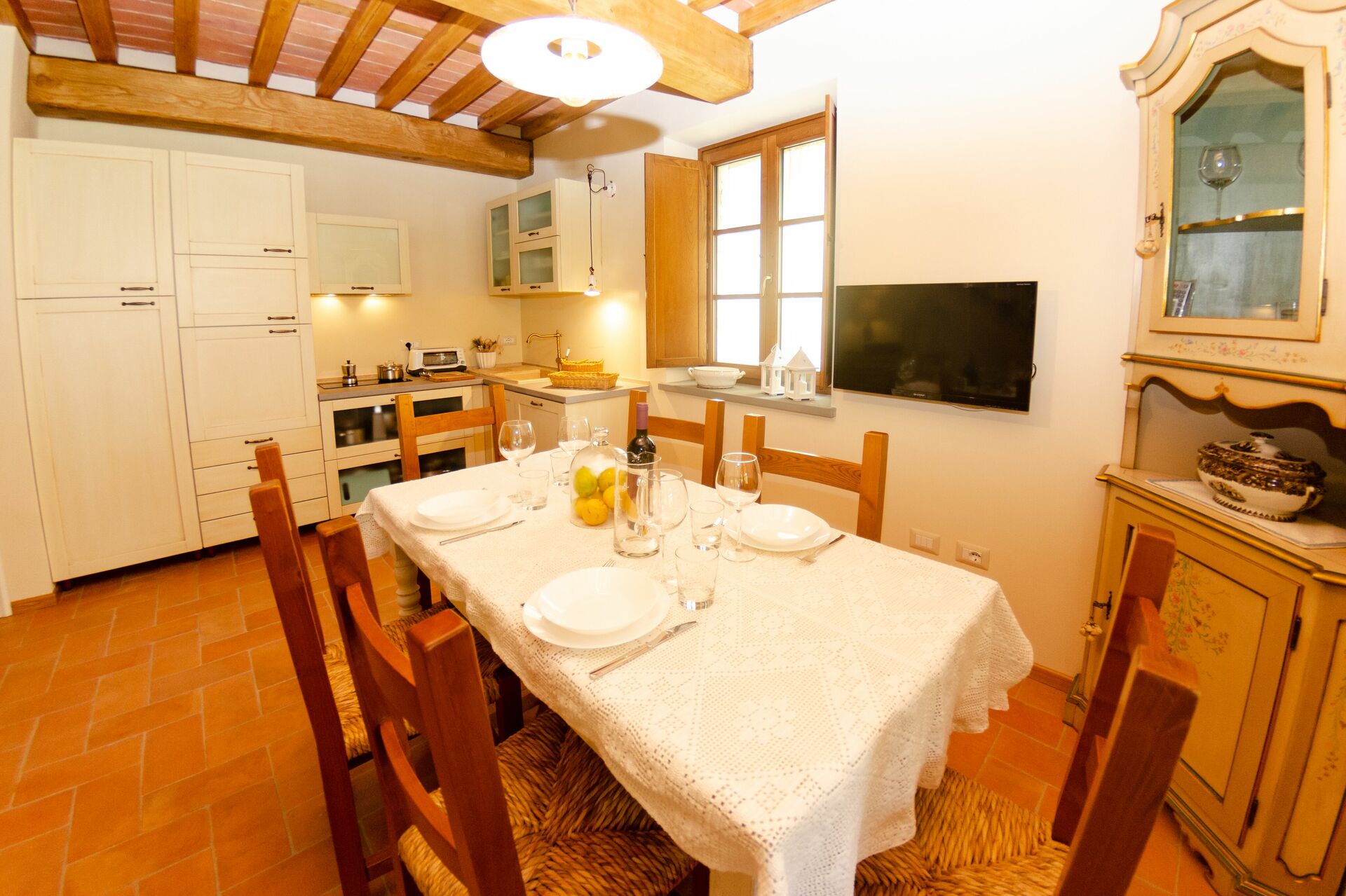 Upon arrival at Colle Di Tramonte you’ll find a nice clean well-maintained property with views of the hills and the mountains perfect for a relaxing vacation in Tuscany. Regardless of how you spend your days - visiting museums, shopping, sightseeing or just driving in the countryside, when you arrive home you can unwind with your family and friends at the pool for a perfect ending to another day in Tuscany. Dining with friends and family is a big part of the Tuscan culture. Take advantage of the well-equipped kitchen to prepare meals using local produce while on your vacation. The kitchen includes microwave, toaster, stove and refrigerator, as well as, plenty of tableware and cutlery for up to eight people.
