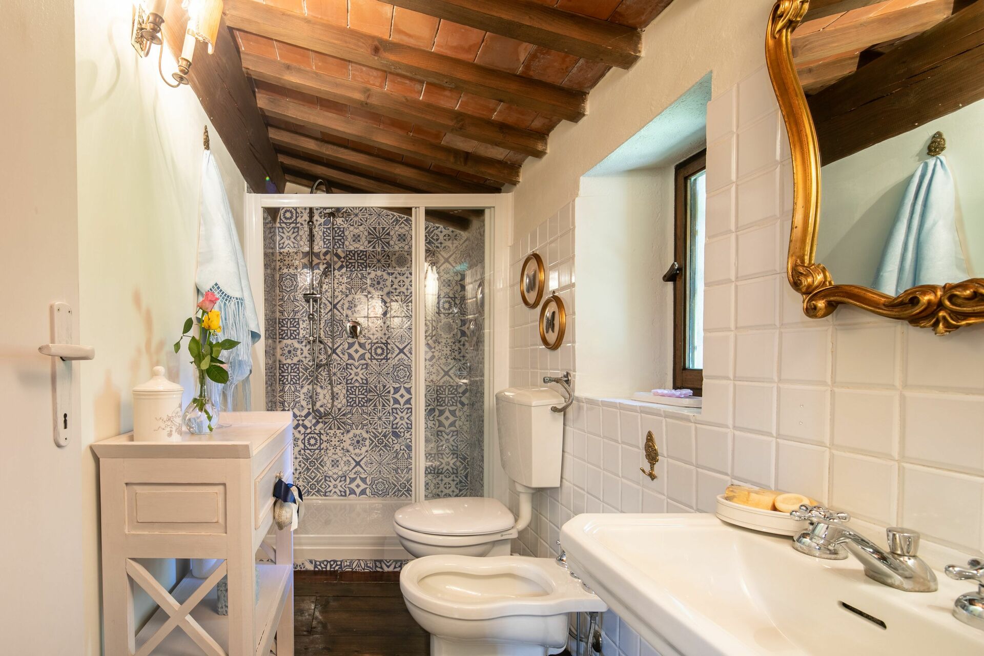Property La Casa Di San Romolo is a lovely property (350 sq m) that includes private pool, WiFi internet and air conditioning. The property can accommodate up to ten guests comfortably in five bedrooms with five bathrooms. Conveniently located in Le Case San Romolo, Italy in the tourist area "Florence And Surroundings" and only 17 km (11 mi) from Florence. In nearby towns there are local shops where you can find fresh produce and other items. If you can't find what you need locally, there is a shopping center located 8 km (5 mi) from the property where you can purchase your groceries and personal items.