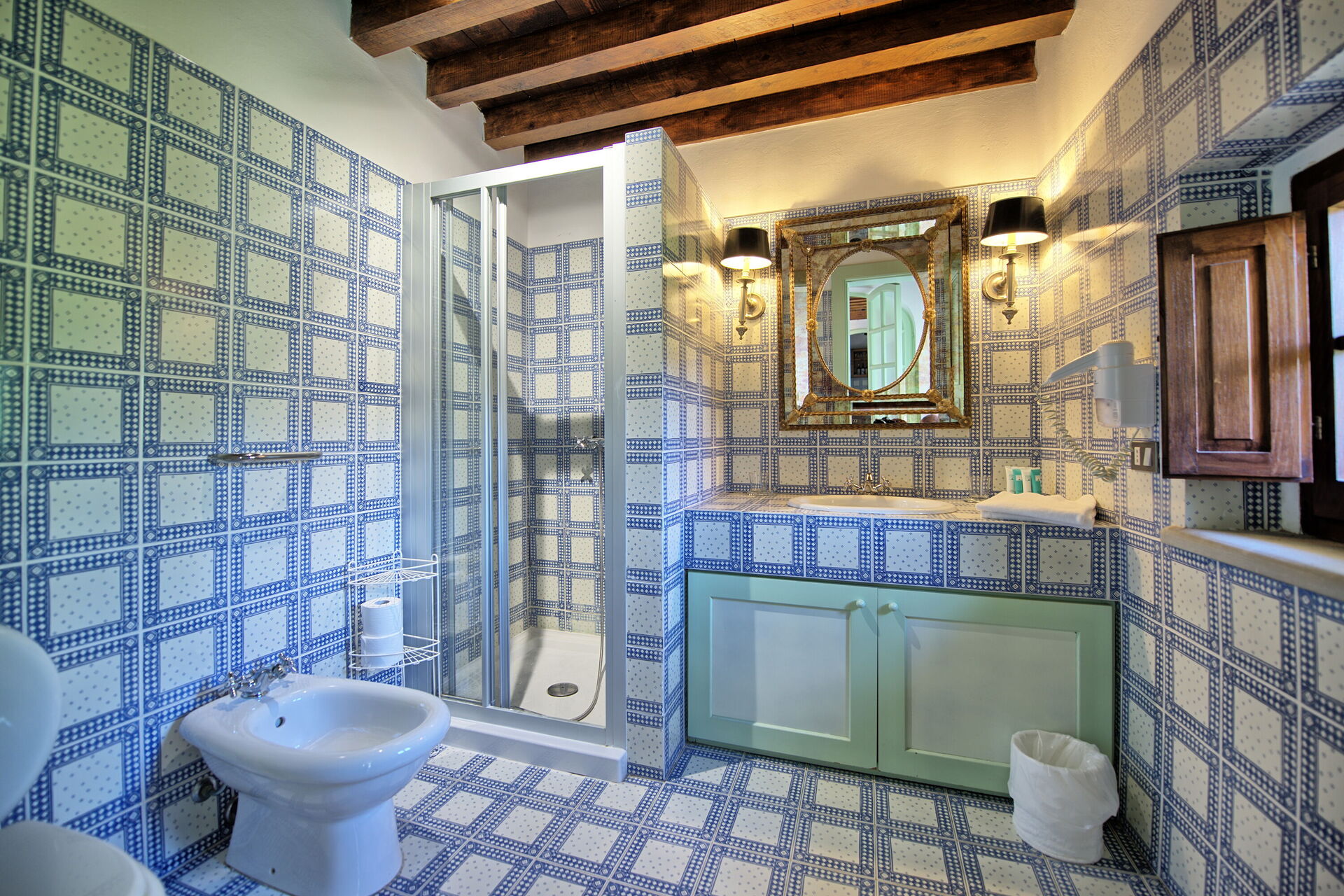First floor: bedroom with single bed, double bedroom (air conditioning) with private bathroom with bathtub, double bedroom (air conditioning) with private bathroom with bathtub.