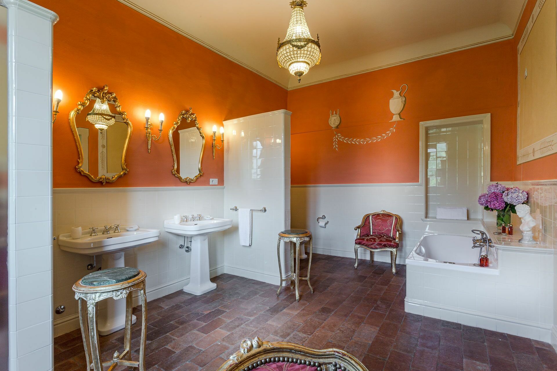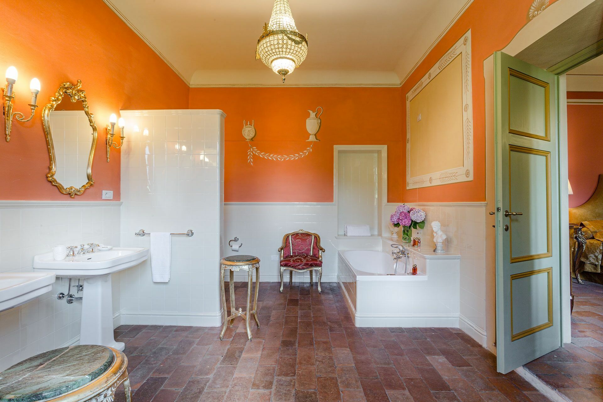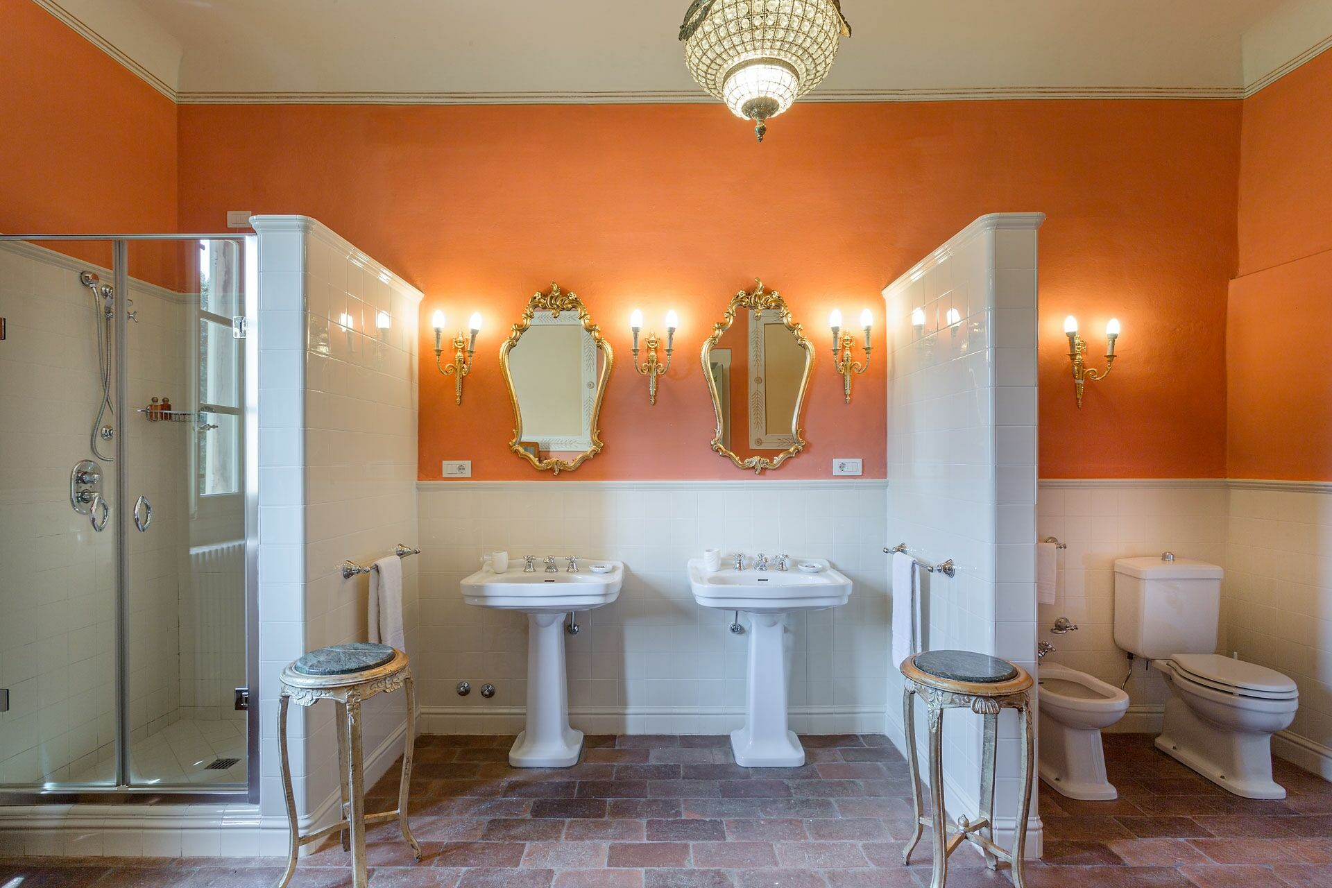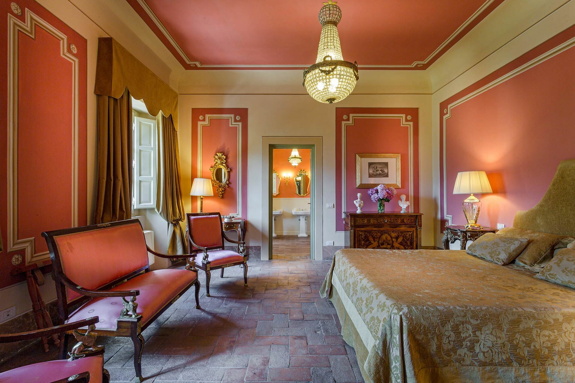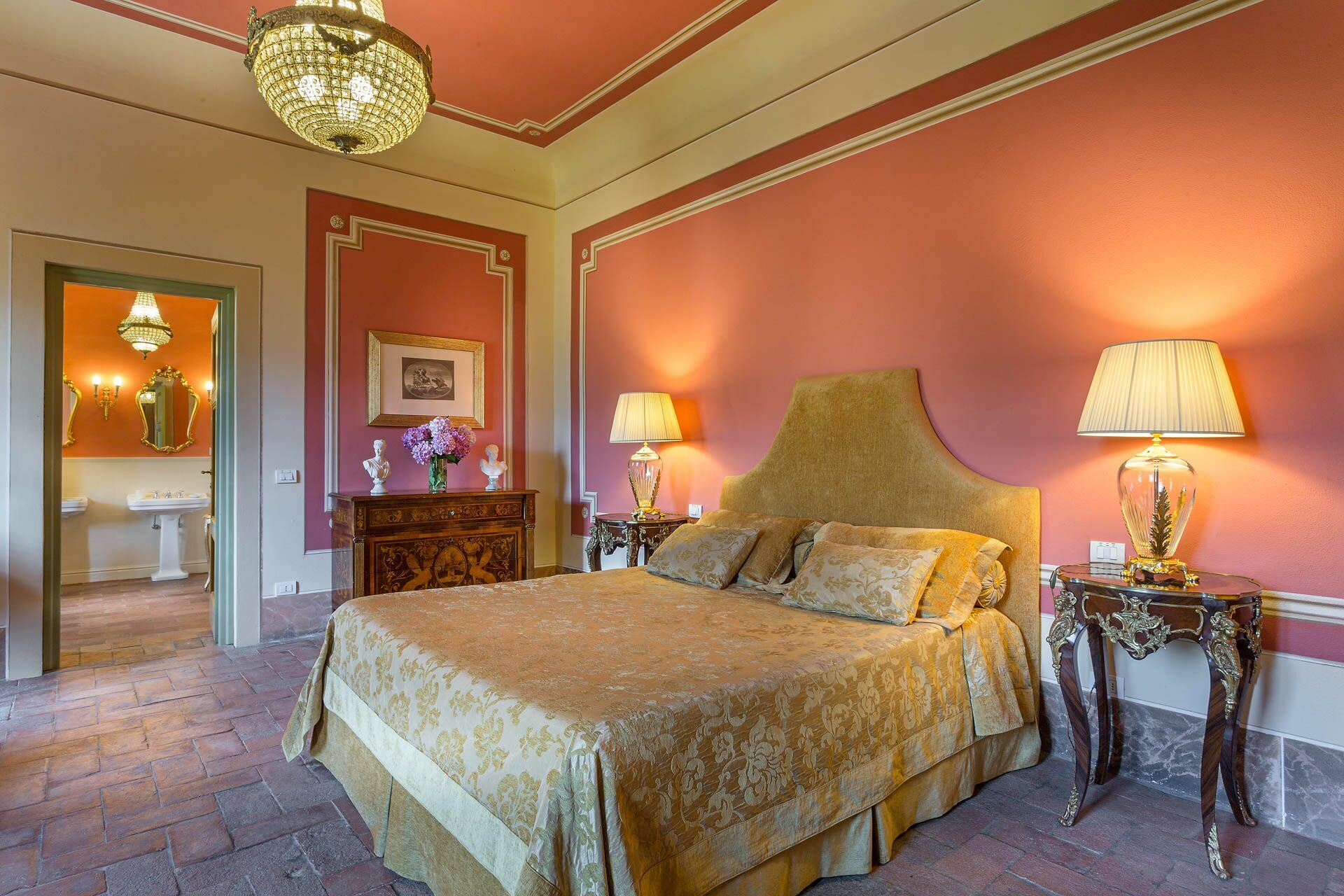Bedroom + Ensuite Bathroom 1: double bed (length: 2m, width: 1.7m), air conditioning, double basin, toilet, bidet, bathtub, shower.