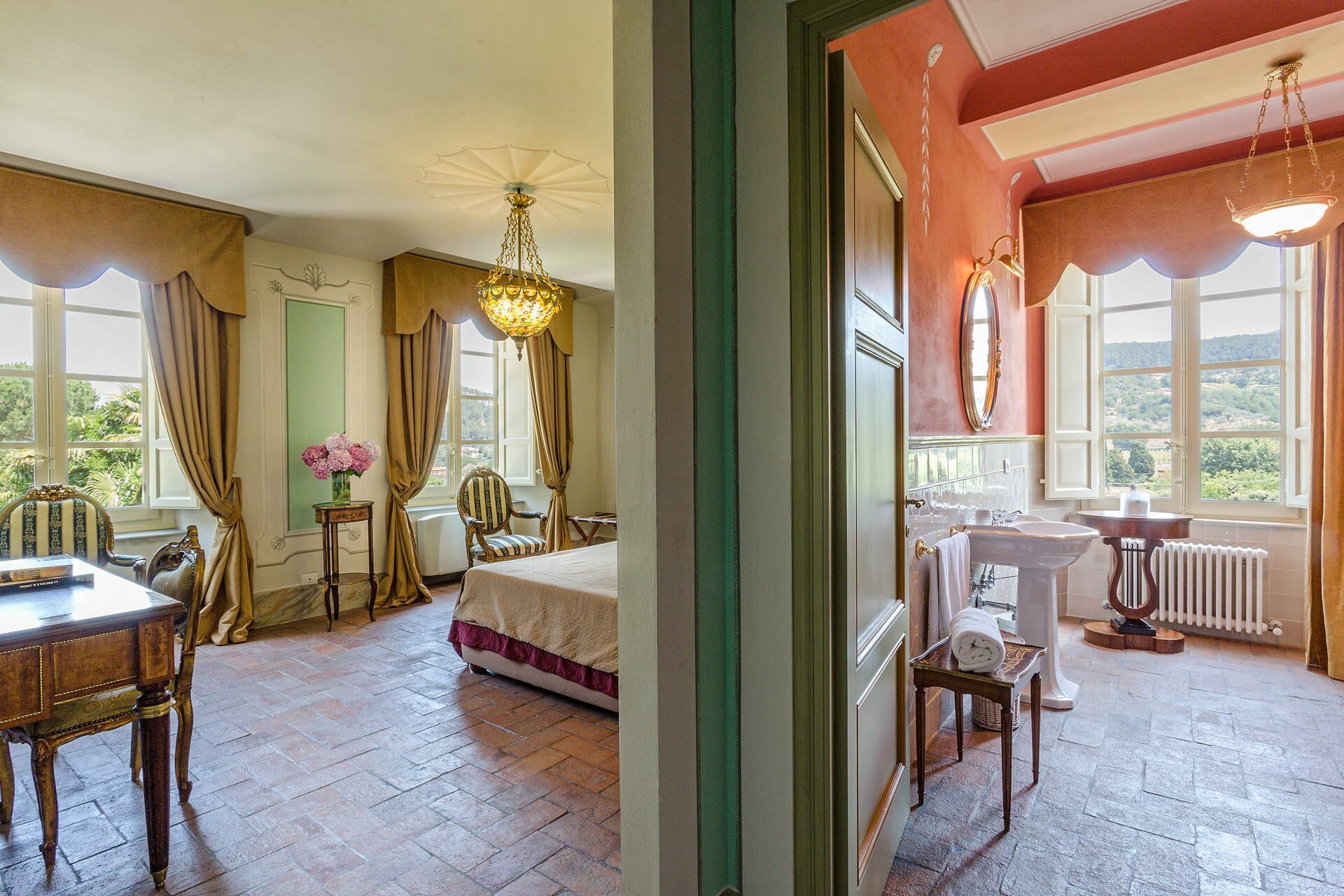 Bedroom + Ensuite Bathroom 4: double bed (length: 2m, width: 1.7m), air conditioning, double basin, toilet, bidet, shower.