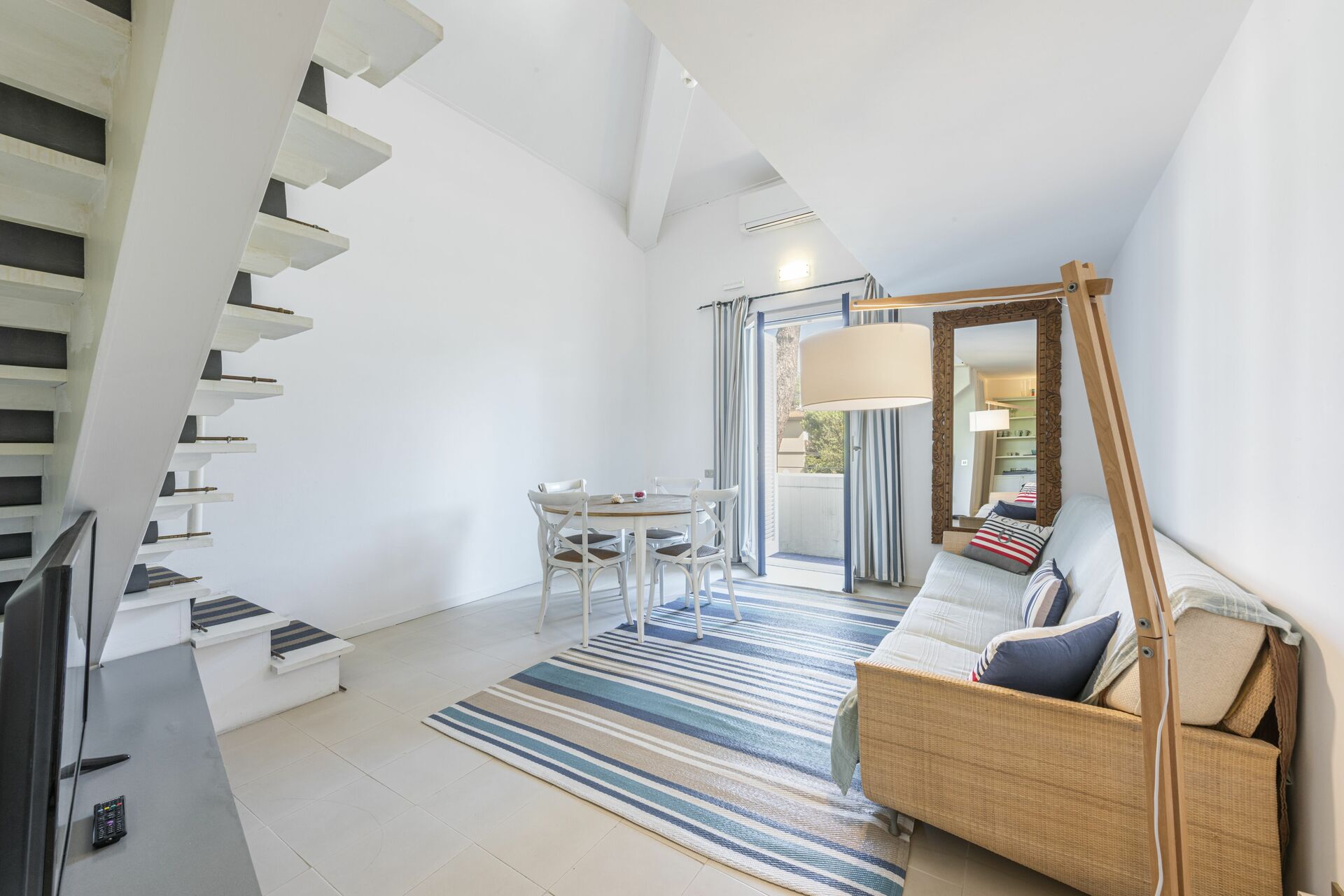 Living room: sofa, dining table (people: 5), air conditioning, television, exit to the balcony.