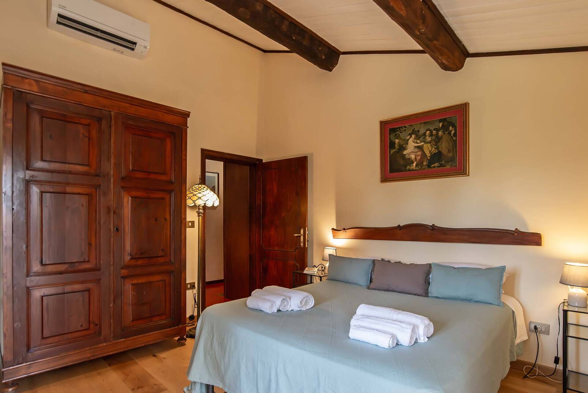 Bedroom + Ensuite Bathroom 1 (16 m2): double bed, single bed, baby crib, WIFI internet, air conditioning, mosquito net, television, portable fan, working desk, basin, toilet, bidet, shower, hairdryer.