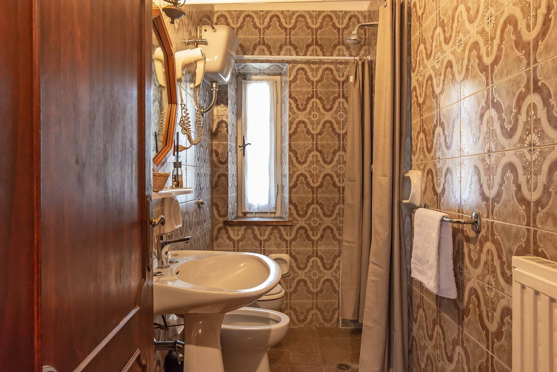 Bathroom: basin, toilet, bidet, shower.