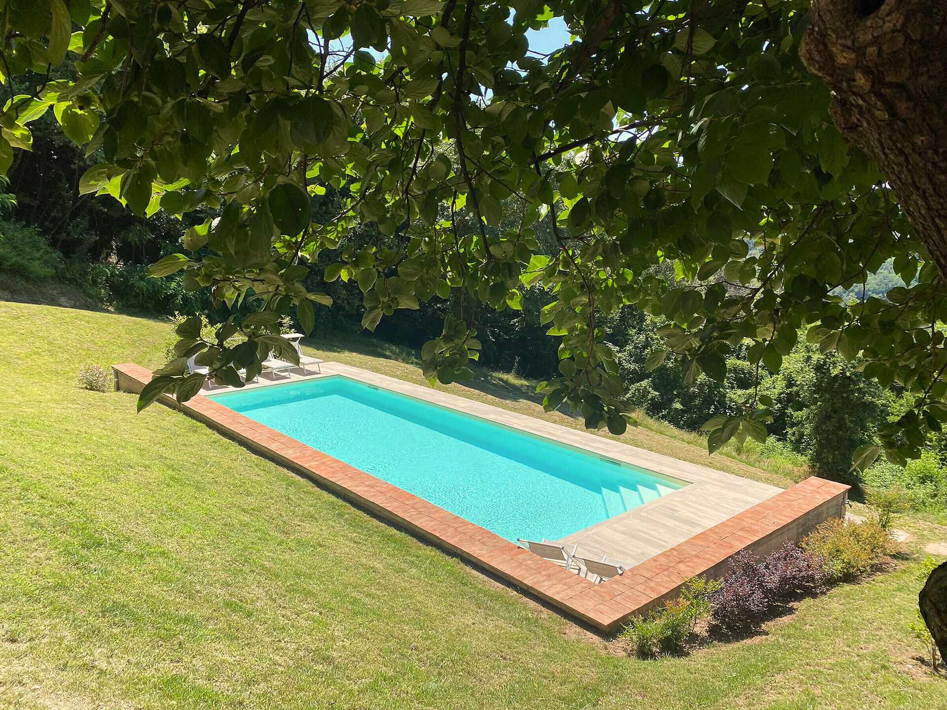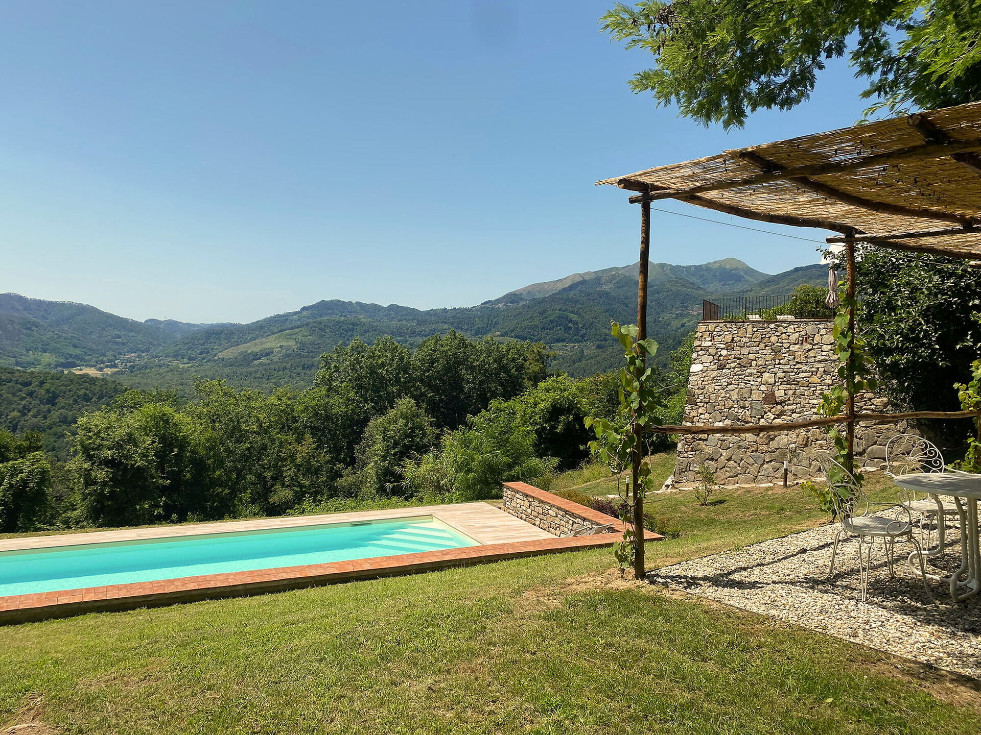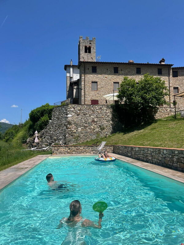 [English translation courtesy of Easy Reserve] Beautiful house, spacious and complete + tastefully decorated. Unique, quiet location on a mountain with fantastic views and lovely pool. Owner Elisa lives next to the house and is nice and helpful. We rented the whole house for 10 people and absolutely recommend it that way. Instead of air conditioning there are fans, the upstairs bedrooms did get very hot (around 28 degrees in July). A car is essential and the road to the house is challenging.