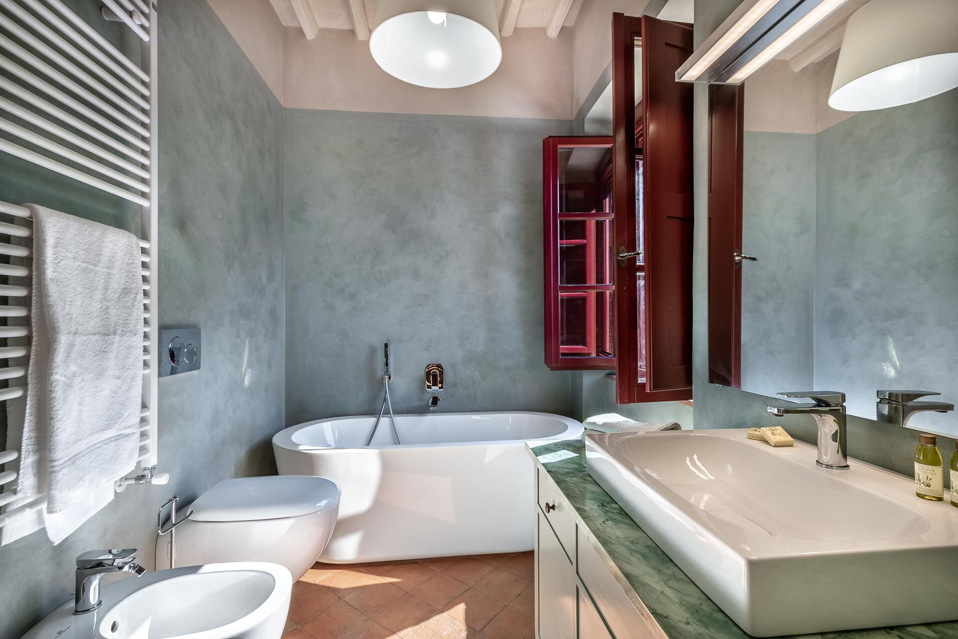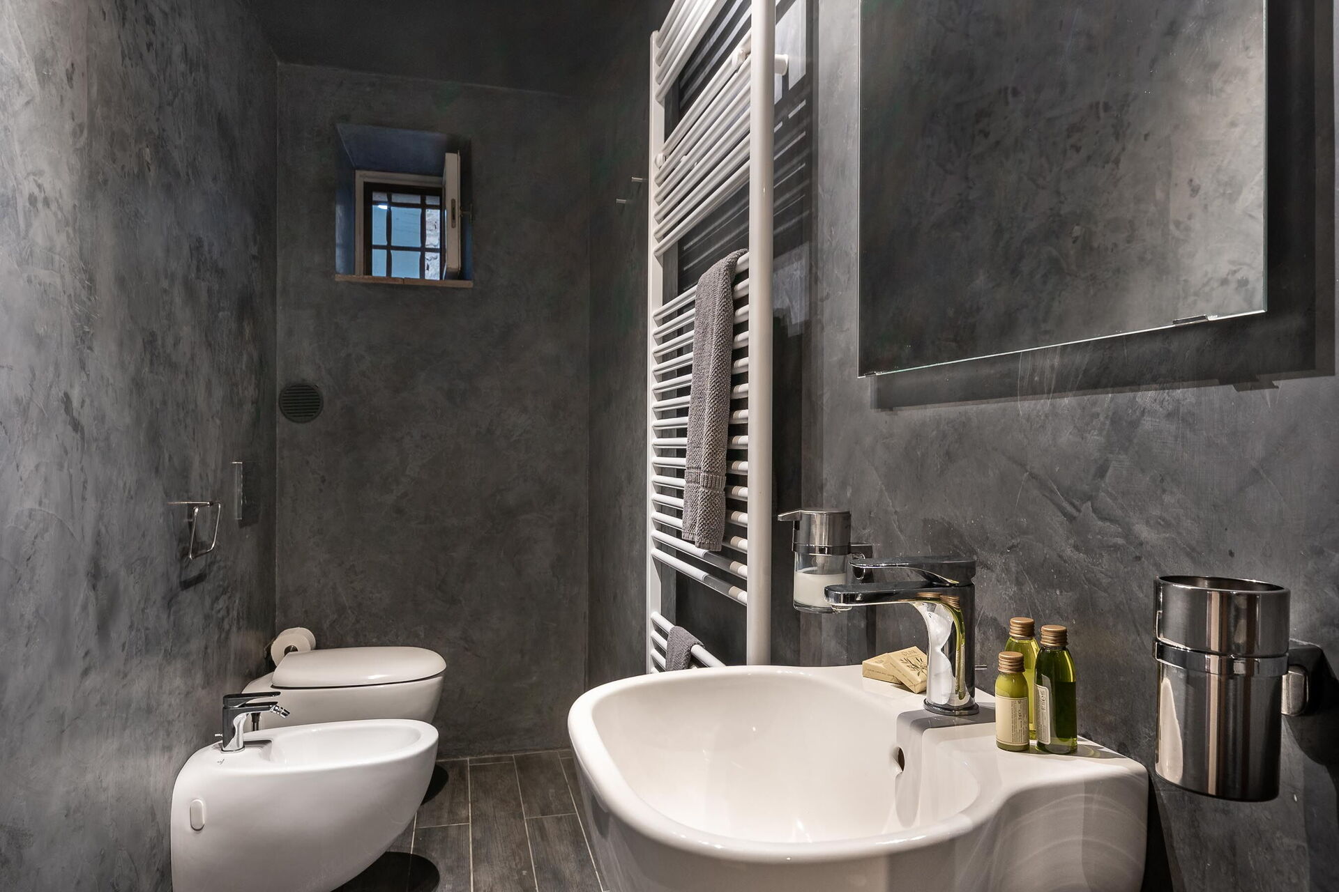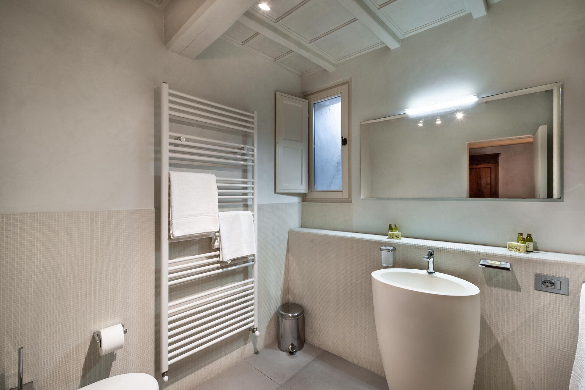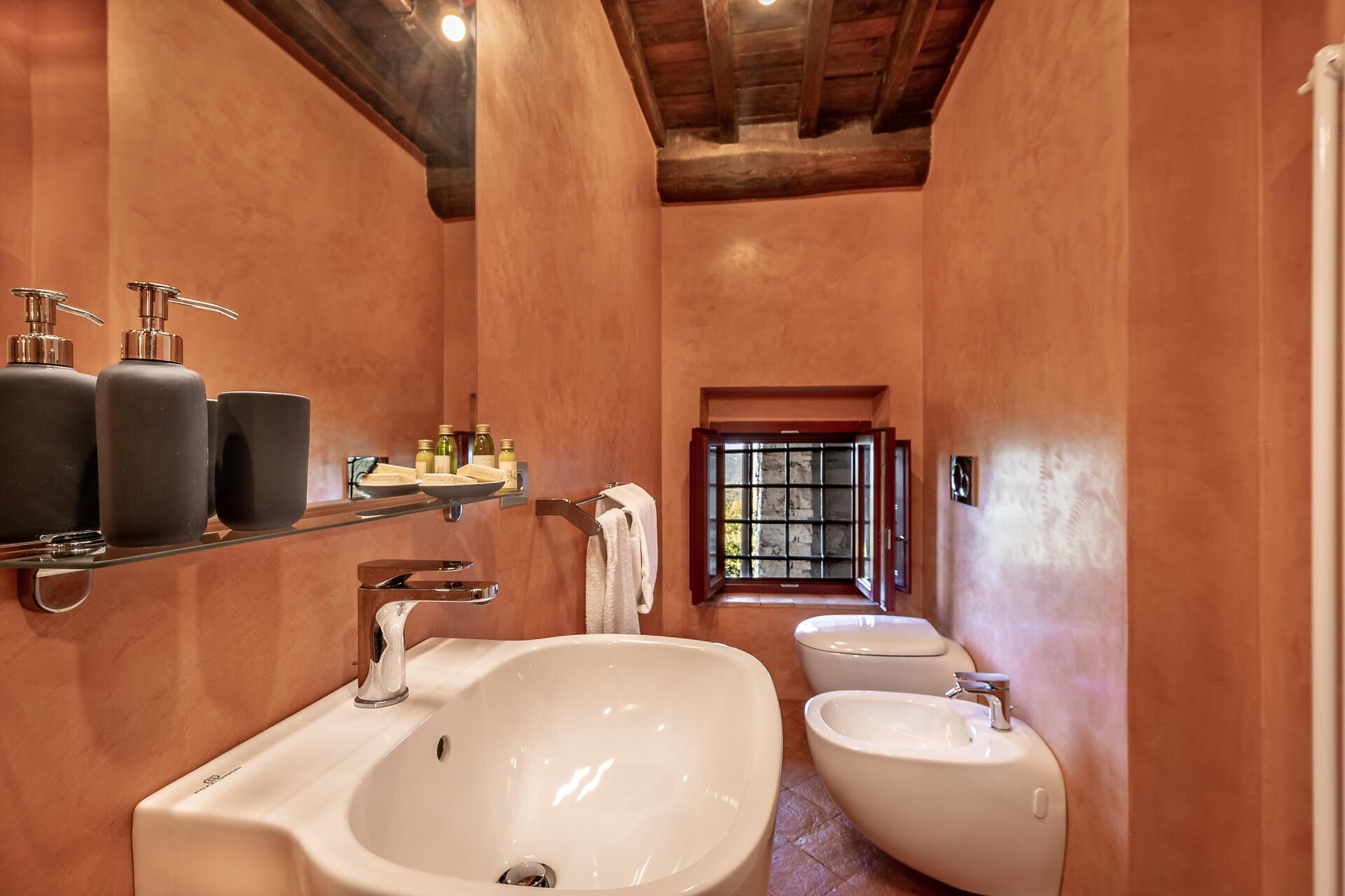 Bathroom: basin, toilet, bidet, shower.