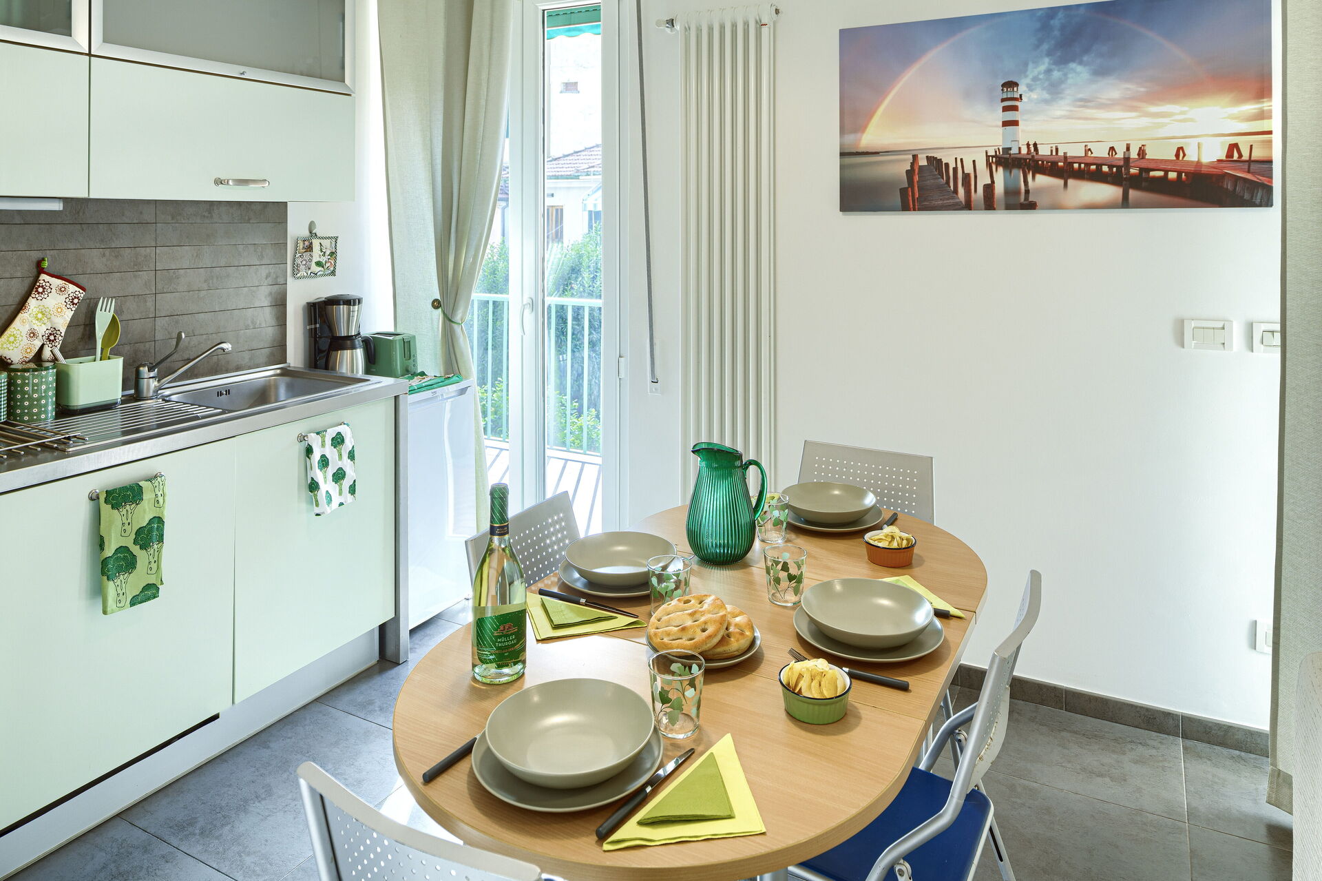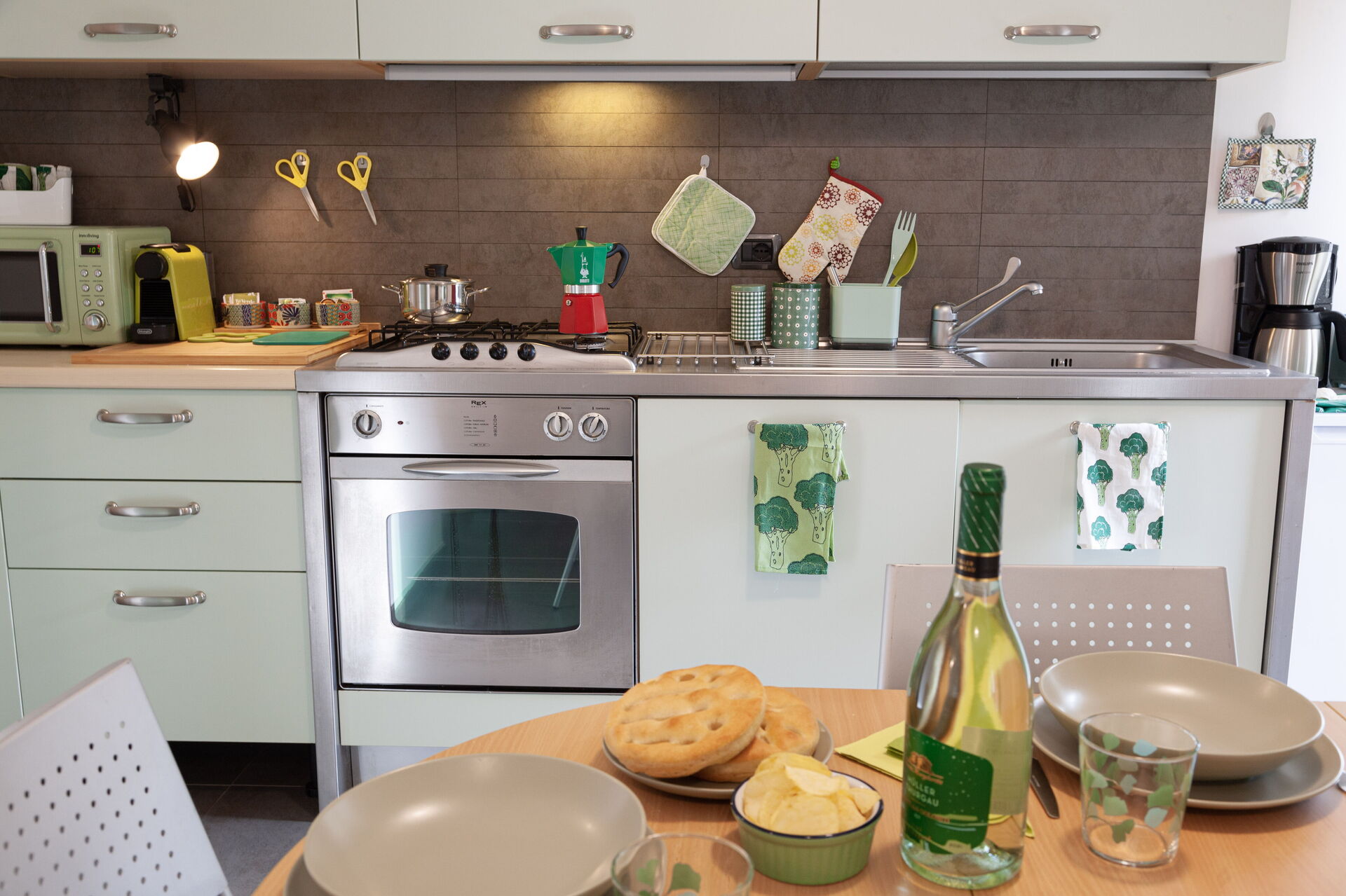 In the kitchen there are: microwave oven, Nespresso coffee machine, American coffee machine, Italian moka, toaster, electric kettle.