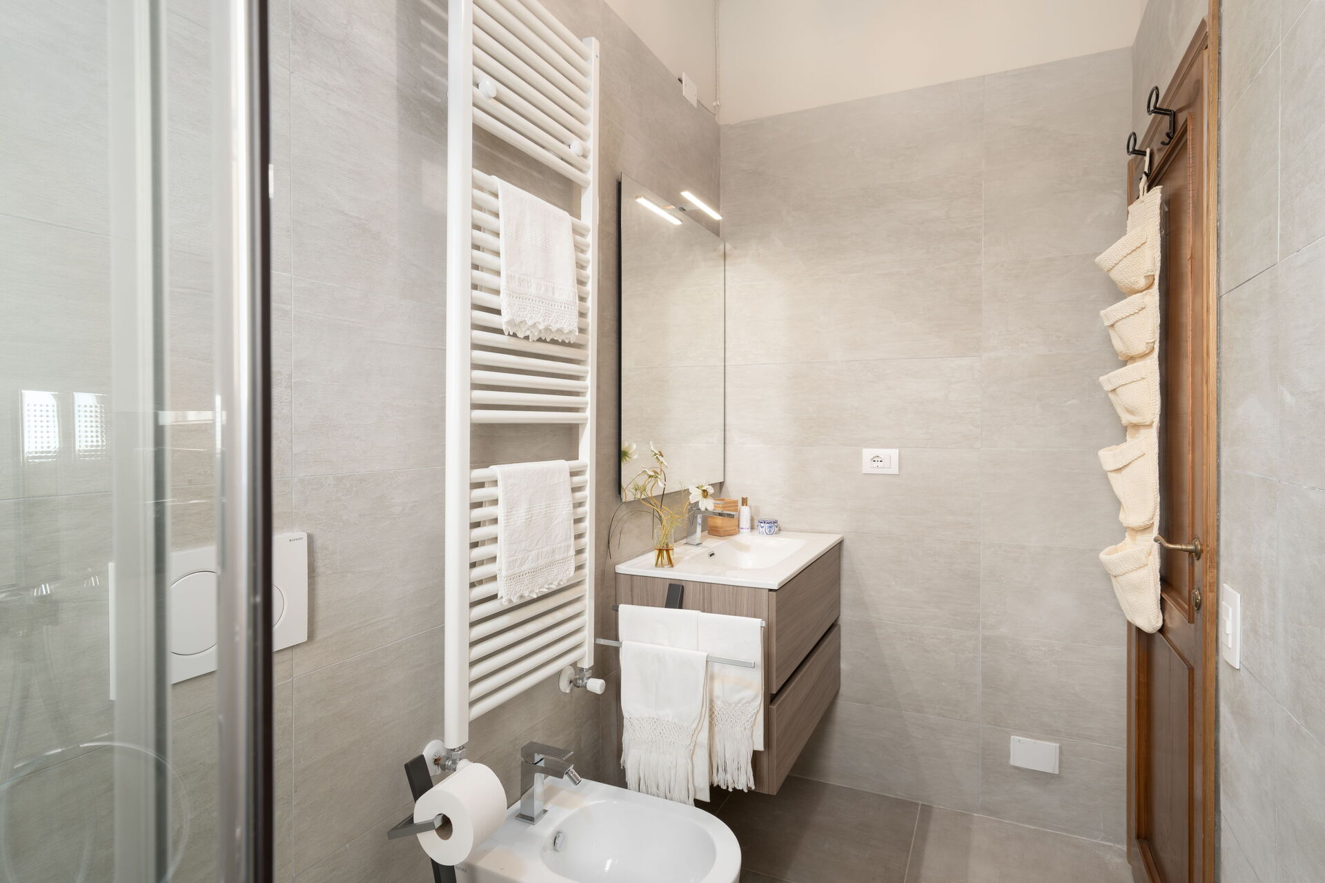 Bathroom: basin, toilet, bidet, shower, washing machine.