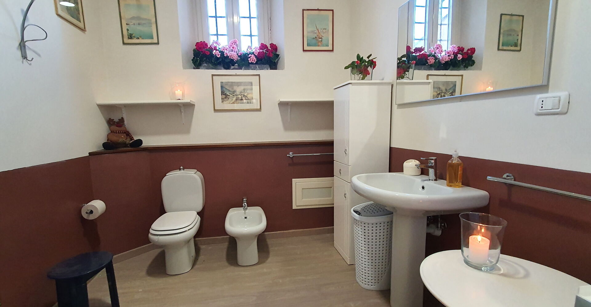 Bathroom 1: basin, toilet, bidet, shower, hairdryer, dryer, washing machine.