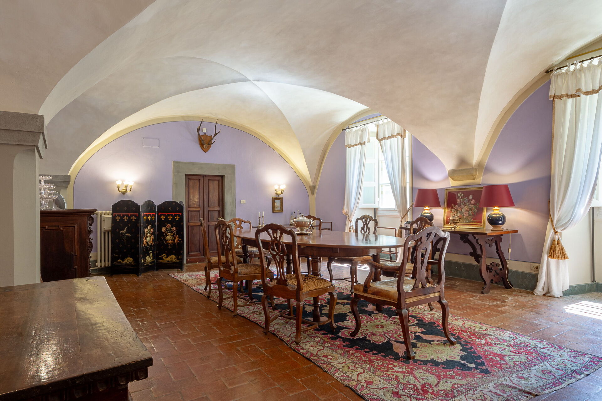 Dining room: two dining tables (people: 7), air conditioning, WIFI internet, satellite tv, fireplace, exit to the garden.