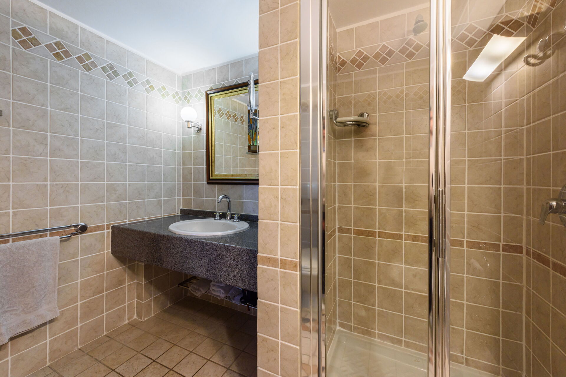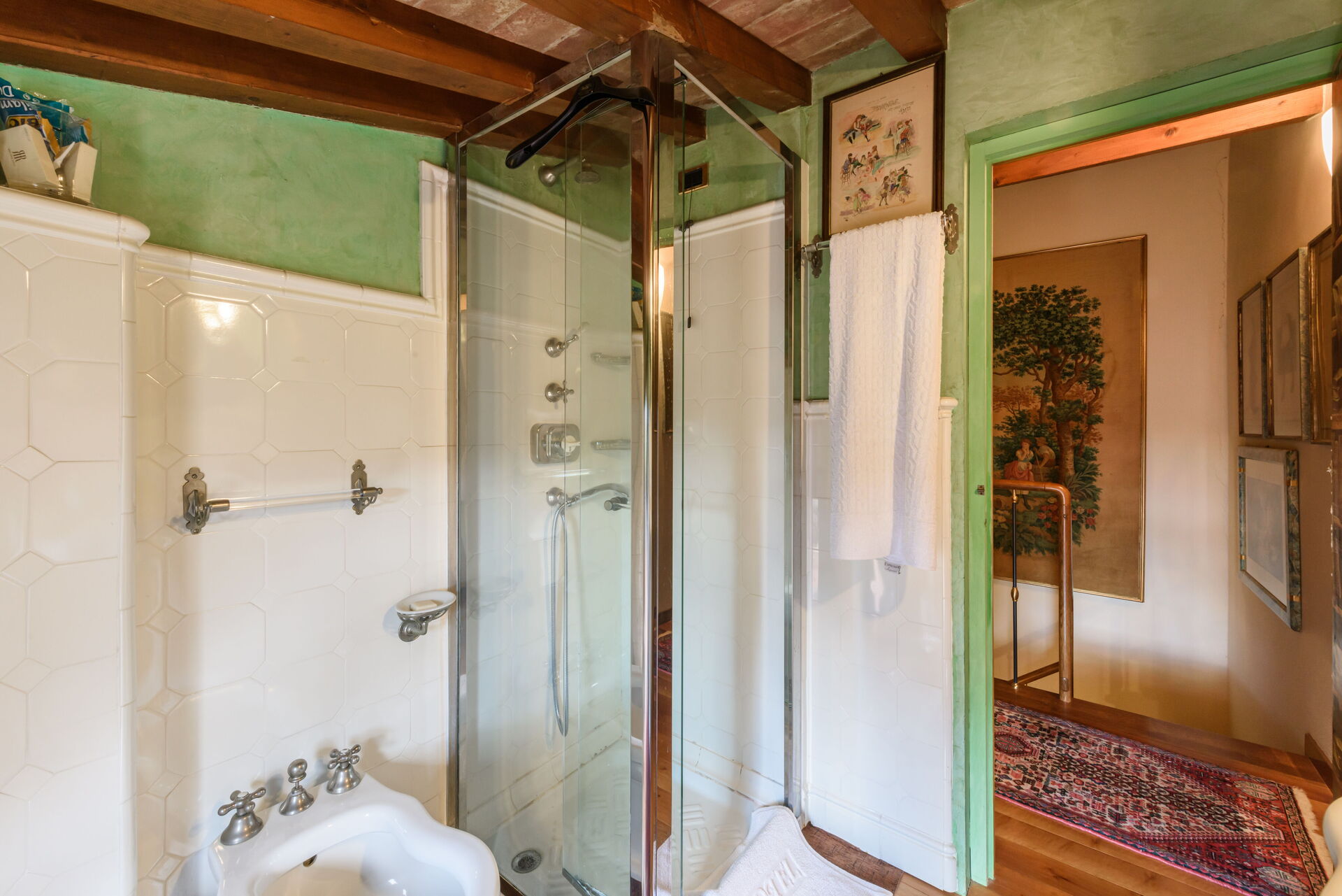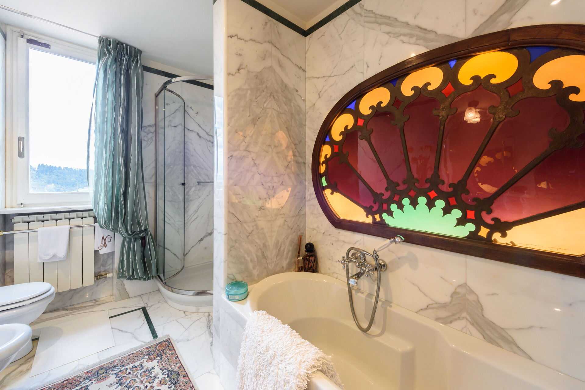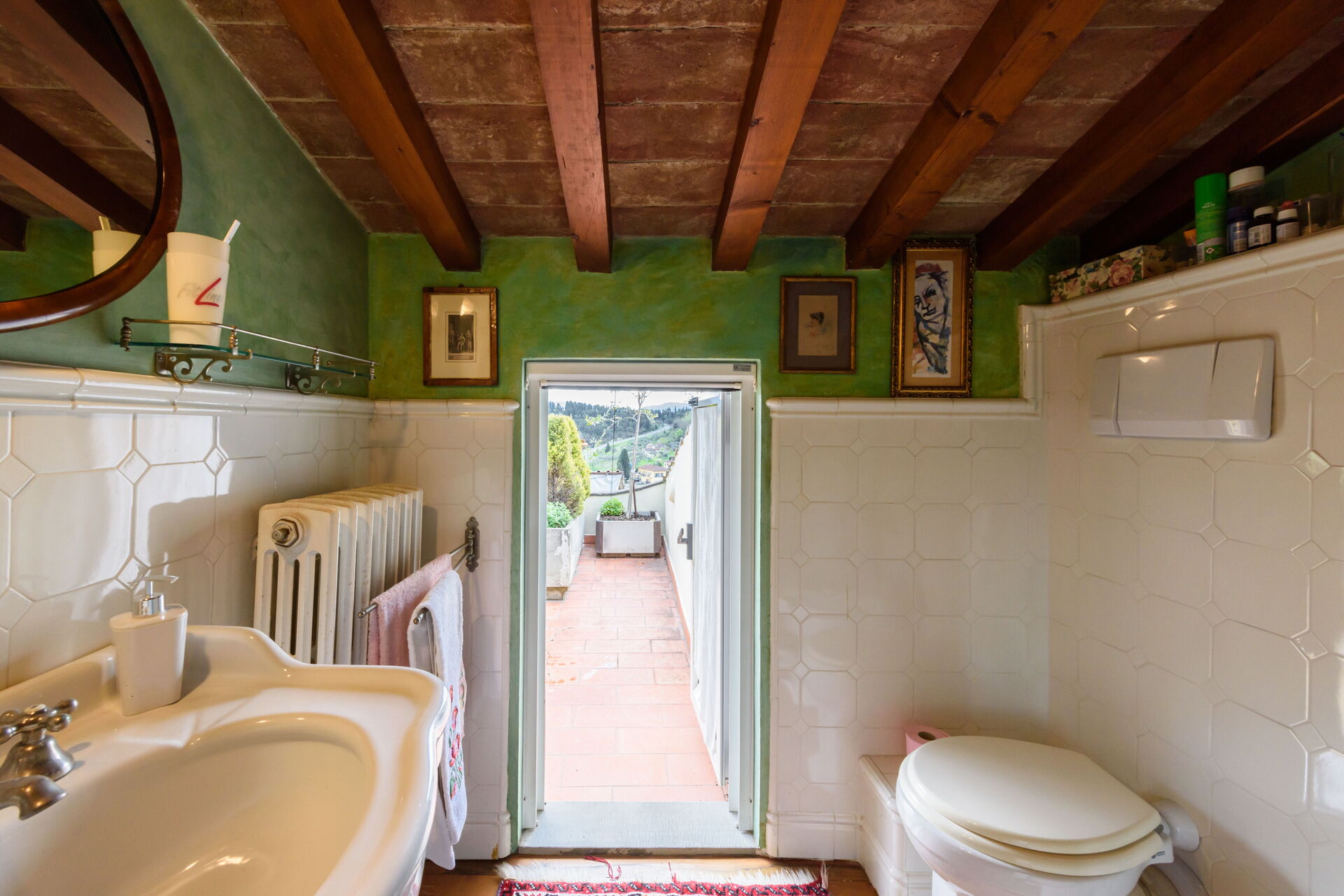 Bathroom: basin, toilet, bidet, shower.