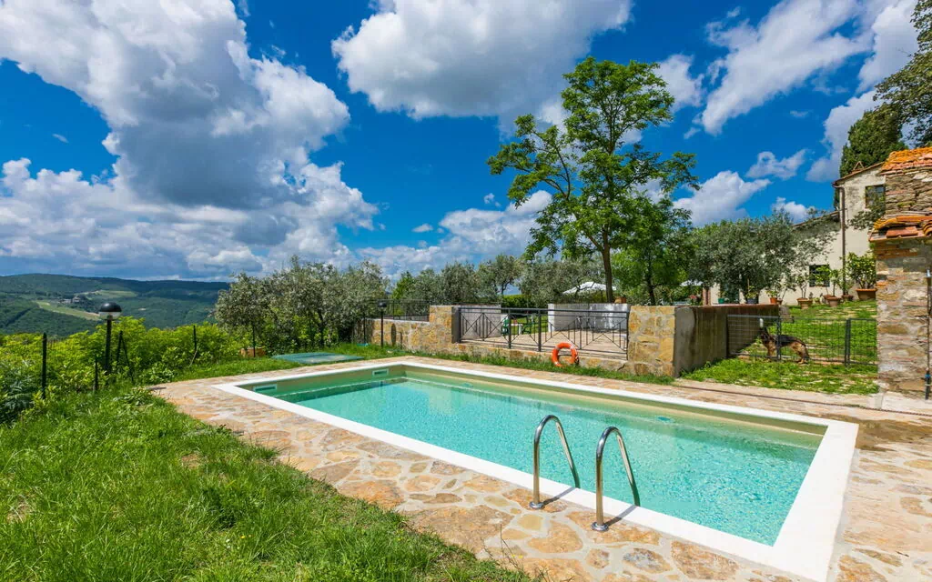 Valmontese is a rustic vacation rental located on an agricultural estate in Greve In Chianti, Italy, surrounded by meadows and vineyards. The property features three apartments within the residence, offering amenities such as a swimming pool, internet WiFi, parking, and an installment plan. The estate provides a natural setting with a fenced area of 5,000 square meters, lush plants, and trees.