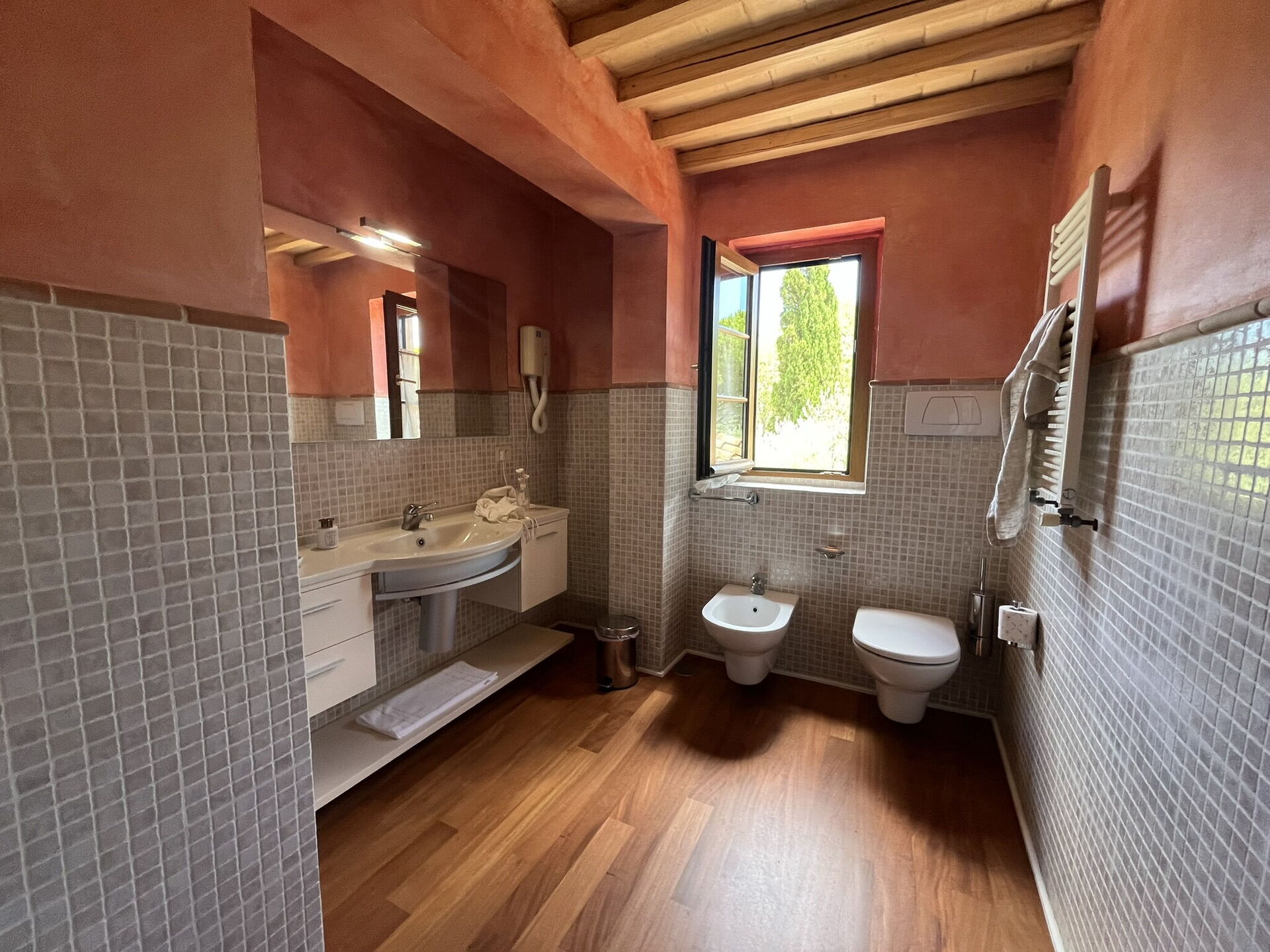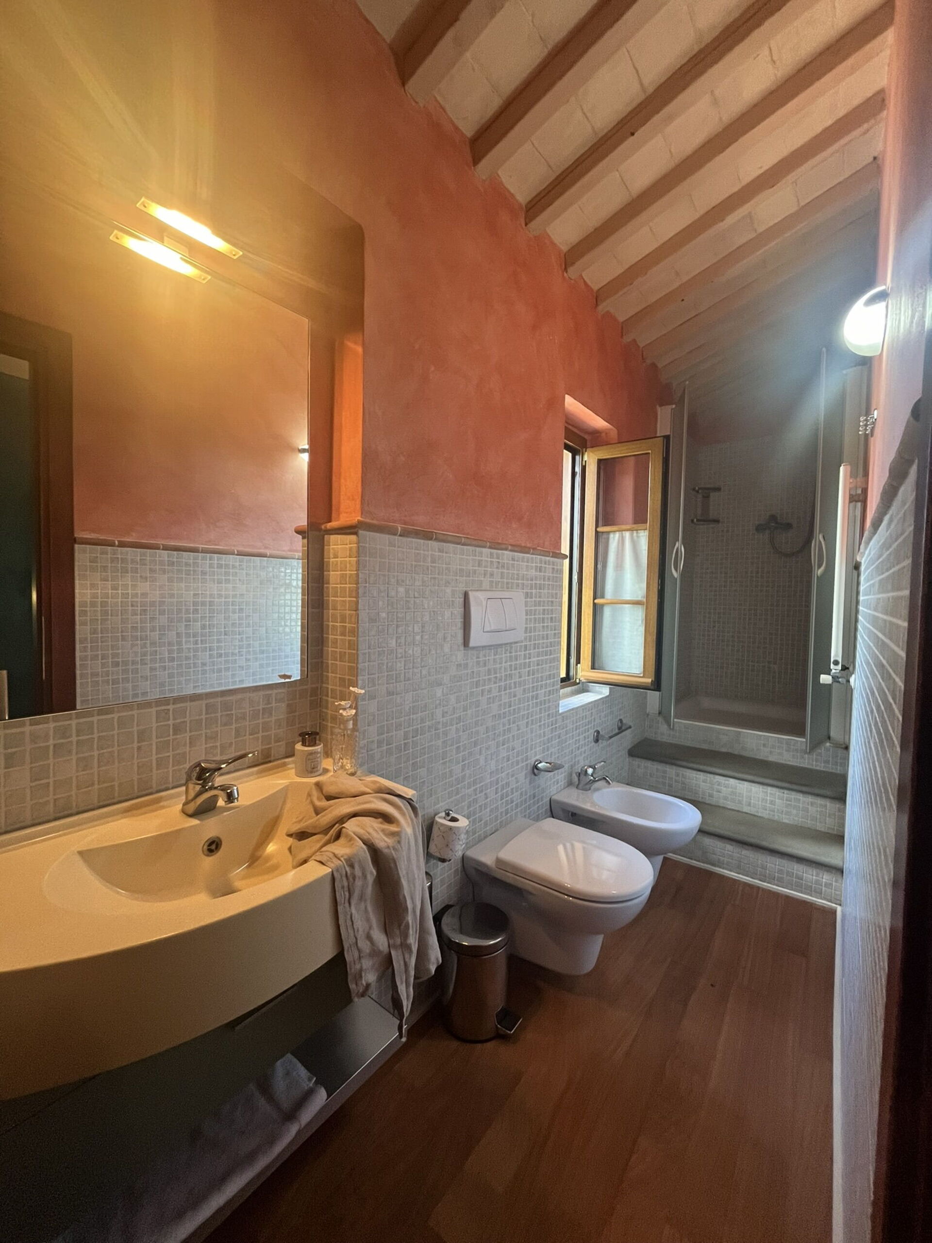 Bathroom: basin, toilet, bidet, shower.