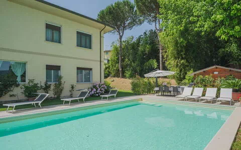 The "Gerry House" is a renovated 2-family house surrounded by fields, offering two apartments on the property. It boasts a terraced garden, a wildlife garden, and a seasonal swimming pool (12 x 6 m, depth 130 cm, available from May 4 to October 4). Guests can enjoy outdoor amenities like a shower, garden furniture, a barbecue area, and parking for up to 4 cars. The property offers a tranquil vacation rental experience in Camaiore, Italy.