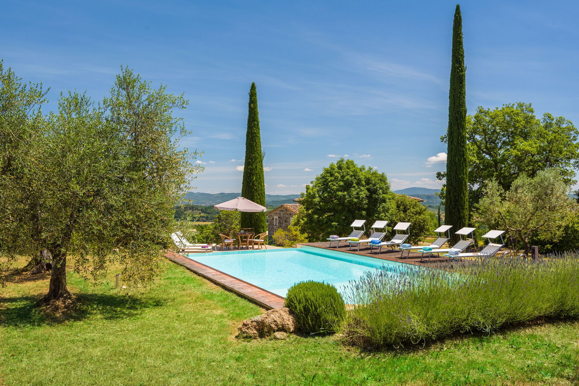 After arriving you will be greeted by the owner or manager where you’ll find a beautiful clean well-maintained property with views of the hills ideal for a splendid holiday in Tuscany. After a busy day of shopping, spend some time with friends and family poolside enjoying a glass of wine - a perfect way to relax at the end the day. Also available outdoors are a barbecue grill and patio. If you enjoy cooking for family and friends there is a well-equipped kitchen including coffee machine, microwave, toaster, stove and refrigerator, as well as, plenty of tableware and cutlery for up to six people. If you prefer to dine 'al fresco', there is a fully furnished patio where you can enjoy the weather while dining outdoors.