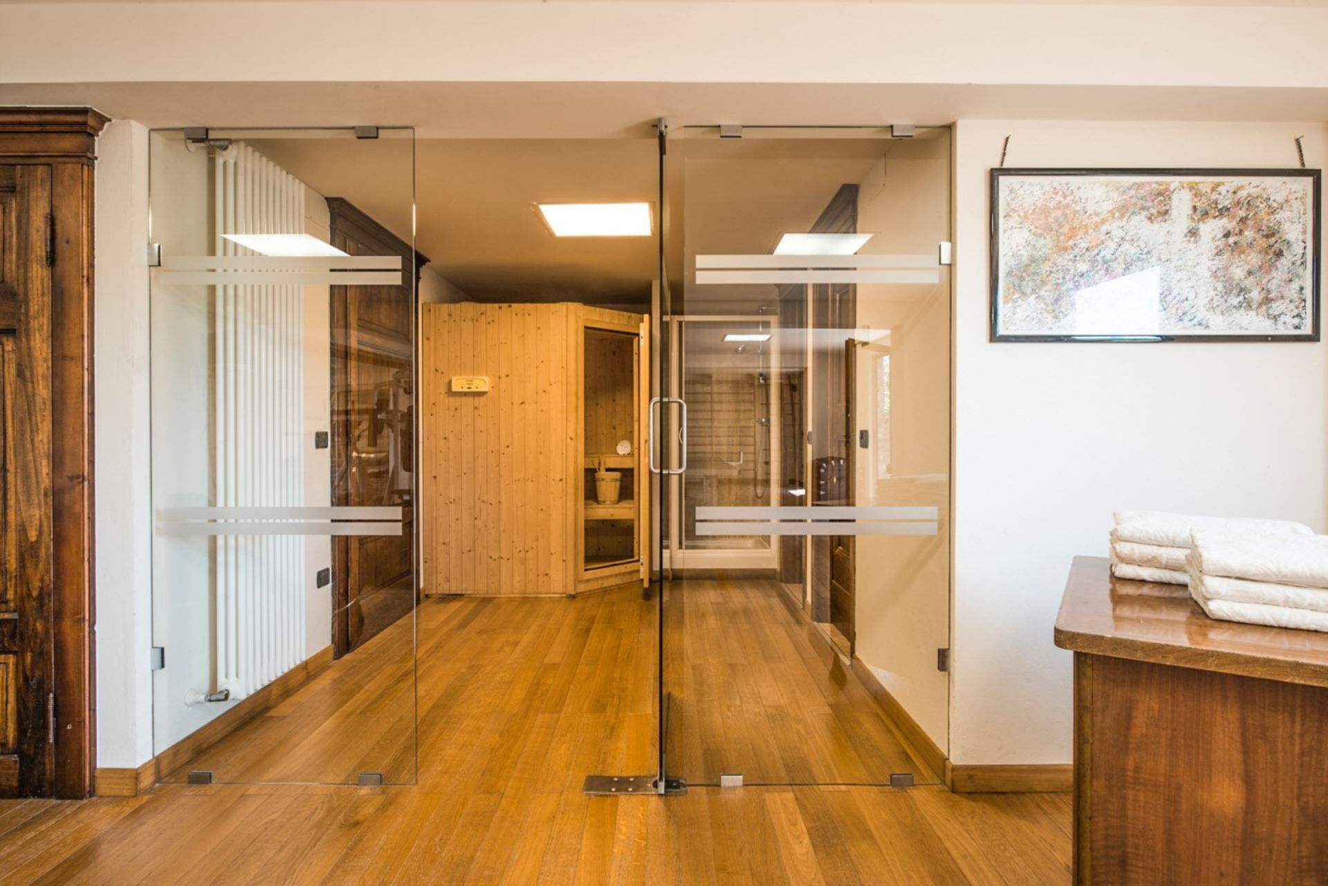 Your stay includes comprehensive amenities designed to enhance your comfort and convenience. Air conditioning is installed in each bedroom throughout the property, ensuring pleasant temperatures during warmer months. Entertainment options include satellite TV and television viewing, while multiple fireplaces in the living areas and kitchen provide warmth and ambiance during cooler evenings. The kitchen is fully equipped with modern appliances including a dishwasher and microwave, alongside the oven, refrigerator with ice dispenser, and freezer already mentioned. Outdoor cooking is facilitated by the barbecue located in the pool house. Every room features a stereo system, allowing you to enjoy your favorite music throughout the property. The villa provides internet connection for staying connected during your stay, and laundry facilities are available for your convenience. The wellness area includes a gym and sauna situated 50 meters from the main villa, offering you opportunities for exercise and relaxation.