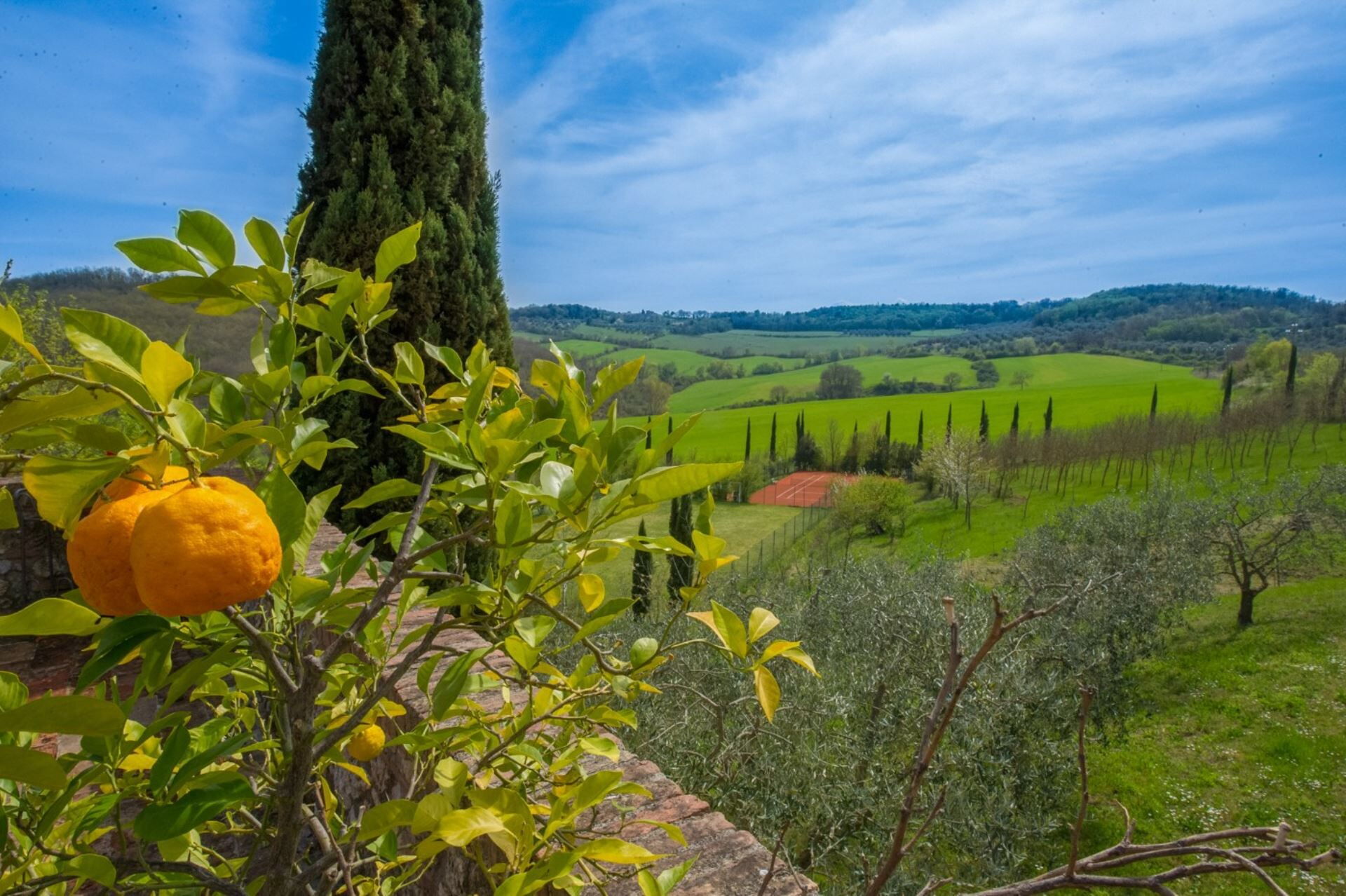 You will discover an extraordinary holiday villa nestled in the gently rolling hills of Monteroni D'arbia, Italy, offering breathtaking views over Siena. This independent residence accommodates up to 18 guests and embodies the warmth and elegance of a private family home through its carefully selected furniture, refined soft furnishings, and thoughtful decorative touches. The property comprises a main building and a separate dependance, both extremely well furnished to ensure your utmost comfort. The estate provides convenient parking and features exceptional recreational facilities including a swimming pool, tennis court, five-a-side football pitch, bowls area, and a dedicated fitness and wellness area with gym and sauna located 50 meters from the villa. The property sits within a working 35-hectare estate that produces olive oil and breeds Cinta Senese pigs, offering you an authentic Tuscan countryside experience.