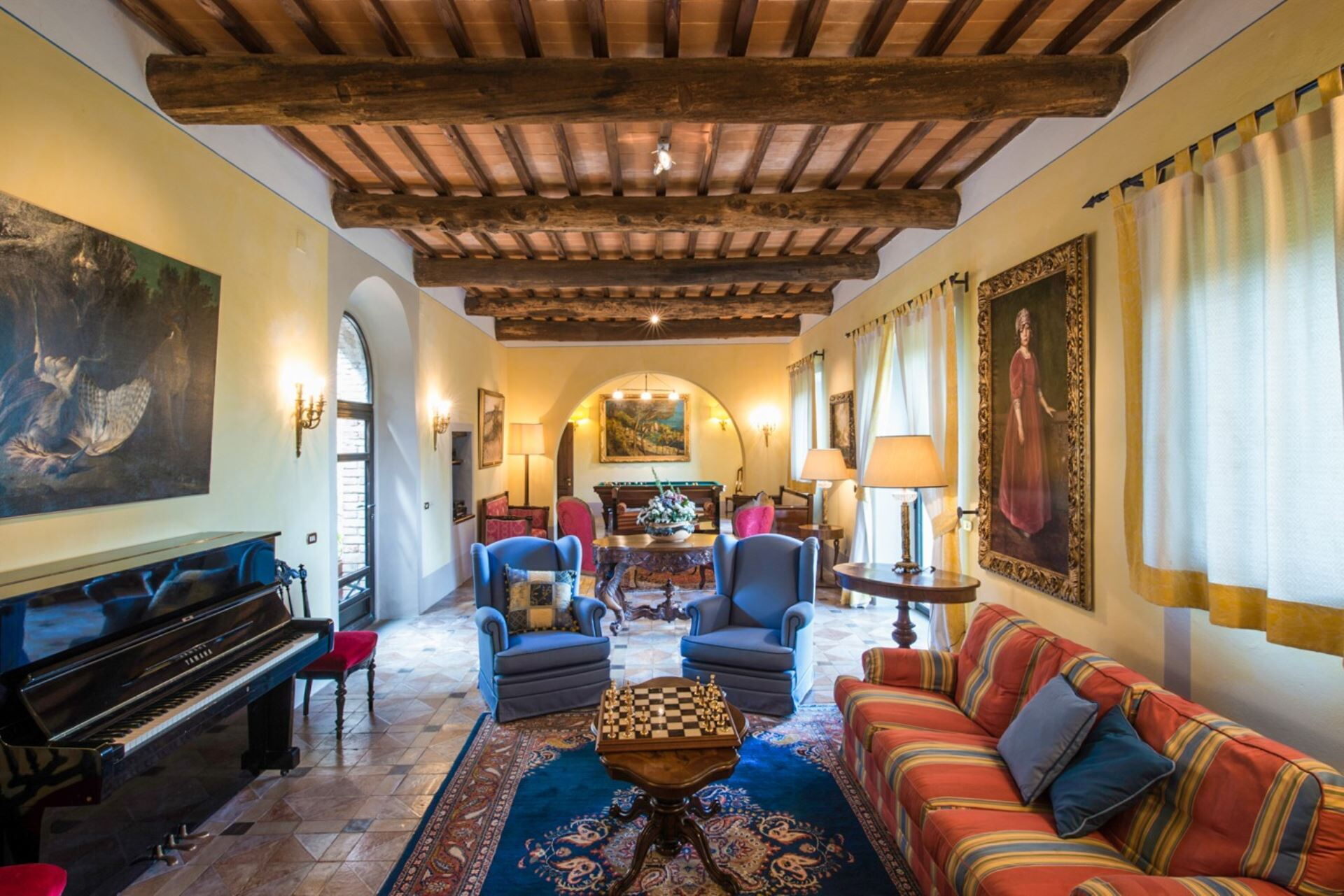 The outdoor spaces of this remarkable property are designed for both relaxation and recreation. The swimming pool measures 15 x 7.5 meters and operates from 01/05 to 31/10, providing a refreshing retreat during the warmer months. Adjacent to the pool, you will find a recently restored building equipped with a kitchen, barbecue facilities, a bathroom with shower, and a stereo system, creating an ideal setting for outdoor entertaining. The property features a tennis court with a professional red-clay surface, perfect for friendly matches and competitive play. For football enthusiasts, a five-a-side football pitch is available, while those seeking more leisurely pursuits can enjoy a game of bowls. The main building's ground floor opens onto a large internal courtyard where you can dine alfresco, enjoying the stunning Tuscan landscape. A traditional pizza oven adds to the outdoor culinary possibilities, allowing you to create authentic Italian meals in the open air.