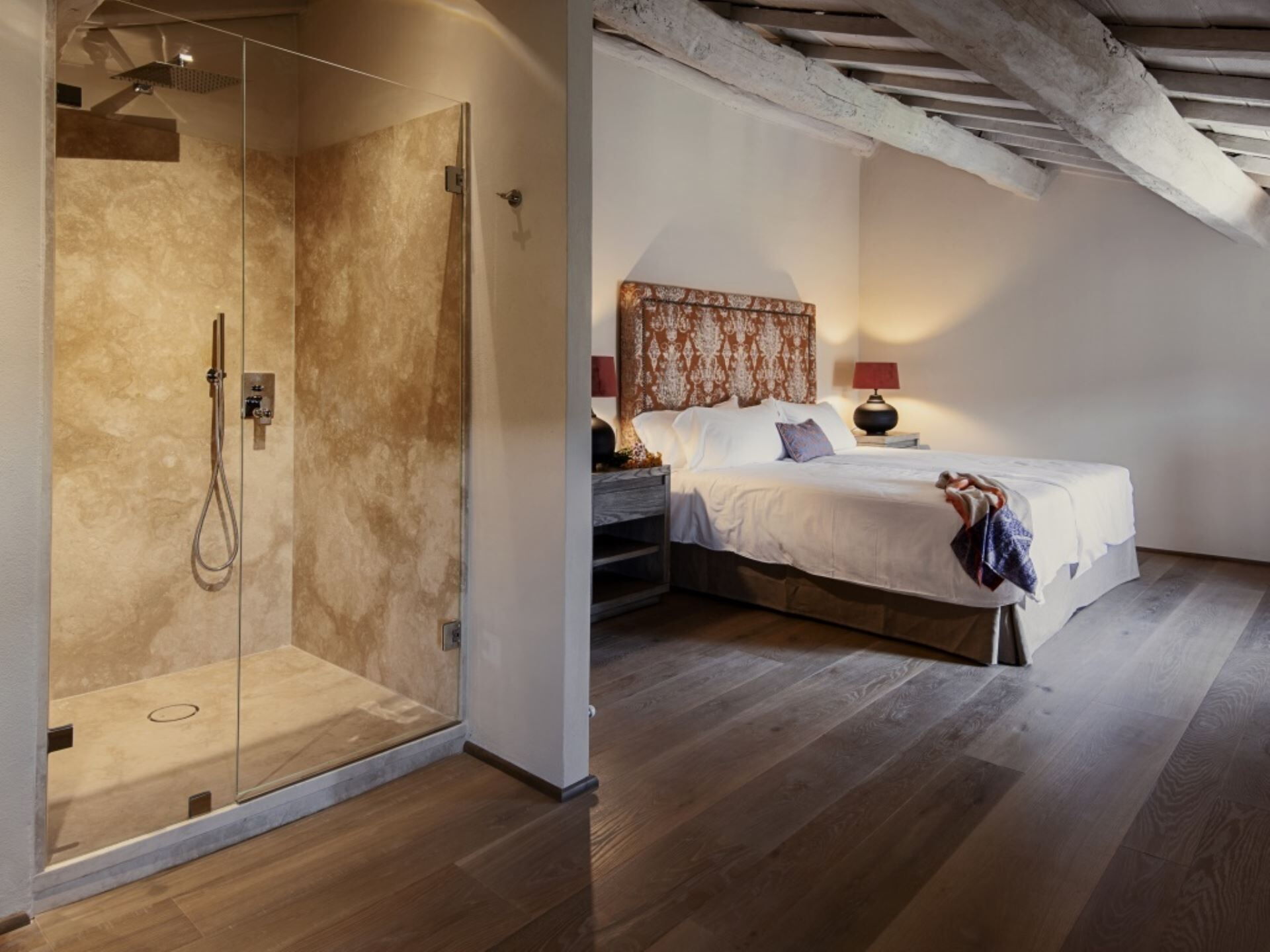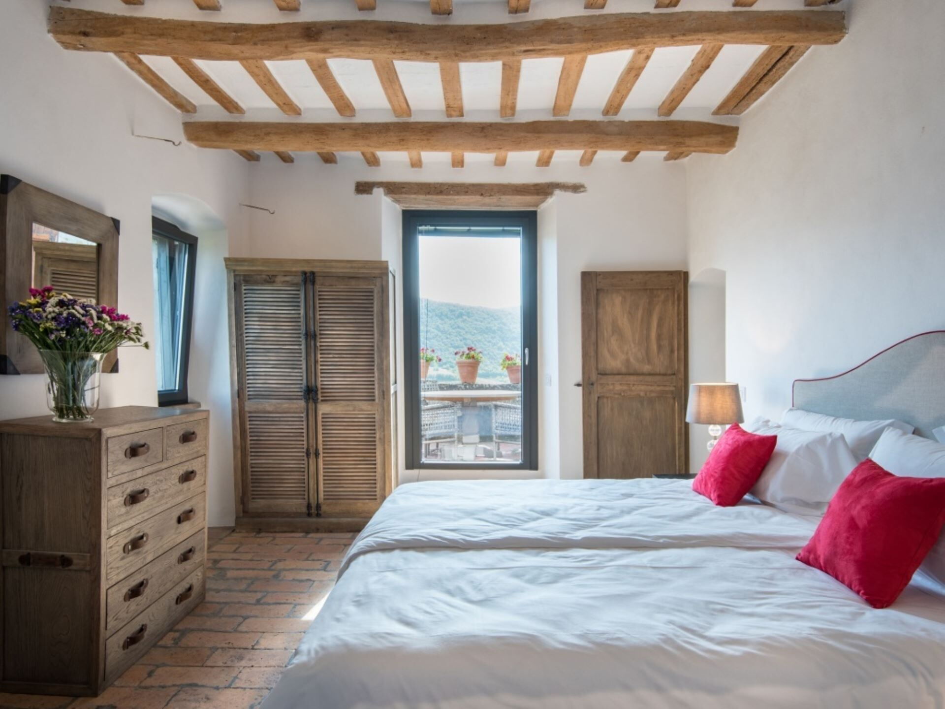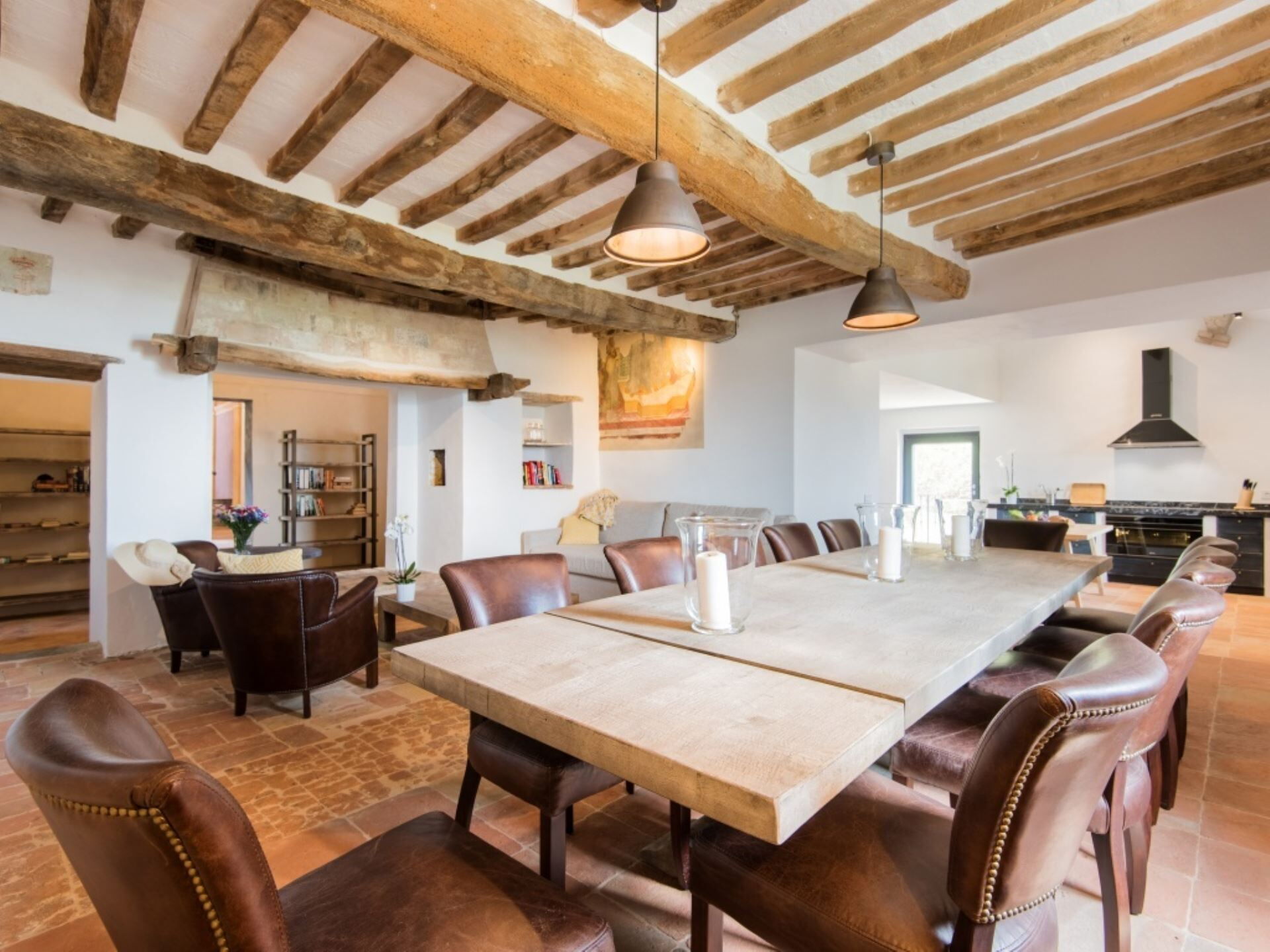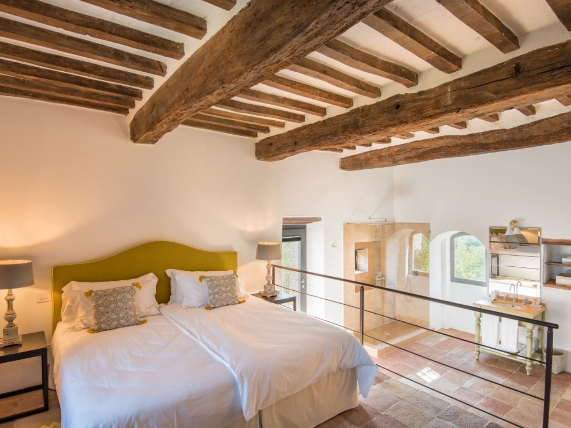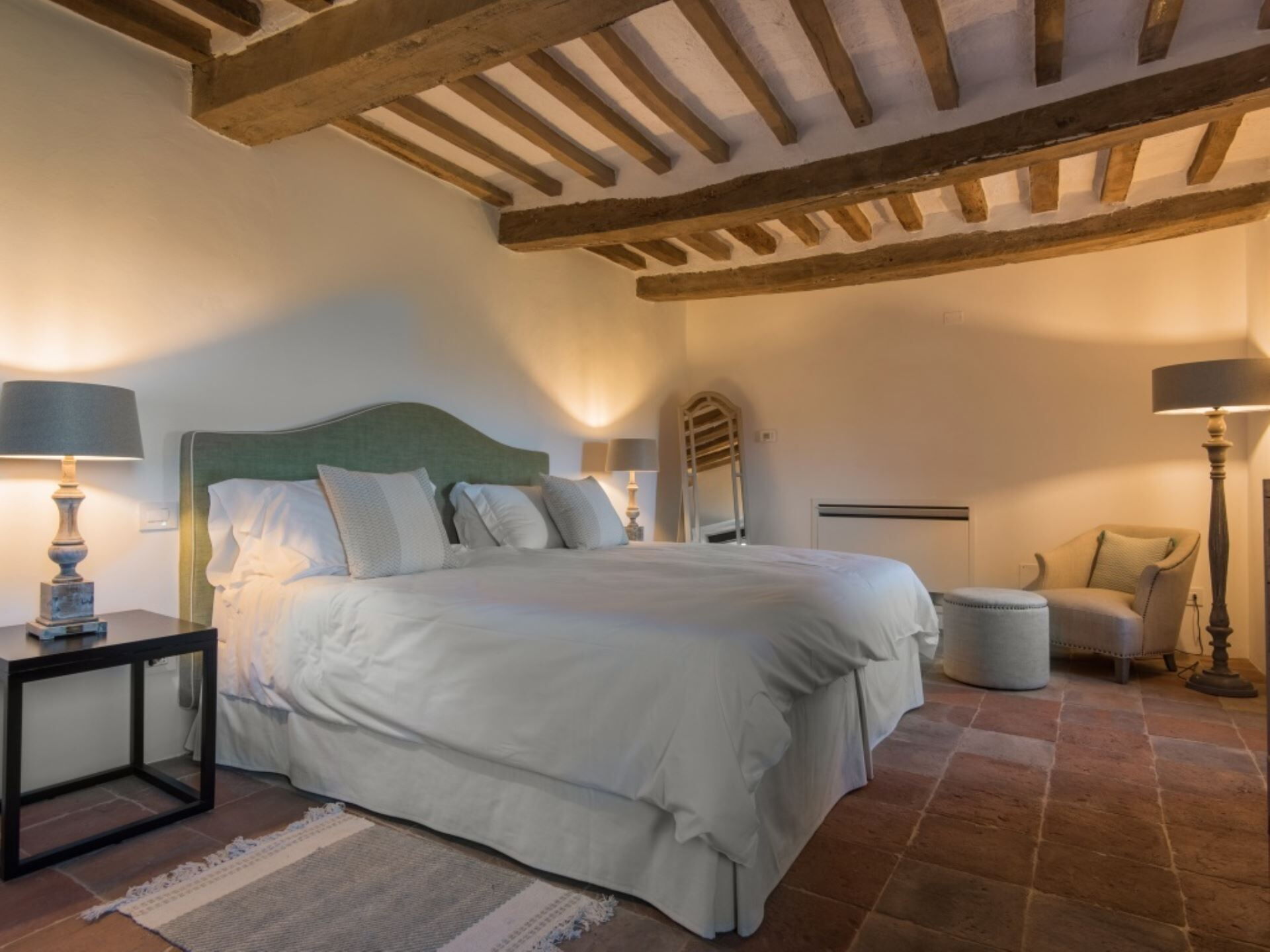 Villa Ugo accommodates a maximum capacity of 20 guests across its thoughtfully designed interior spaces, which are divided between the main historic residence and a separate annex building. The property offers a total of 10 bedrooms and 10 bathrooms, ensuring privacy and comfort for all occupants. The main villa houses 6 super king size bedrooms, each appointed with its own precious private marble bathroom, while the remaining 4 super king size bedrooms with private marble bathrooms are located in the annex structure on the opposite side of the garden. The main residence features expansive living areas that exude elegance without ostentation, achieved through the perfect blend of ancient architectural elements and modern comforts. Original terracotta floors flow throughout the spaces, while spectacular frescoes dating back to the 13th century adorn the walls, and travertine marble stairs connect the various levels of this historic castle. The dining room in the main villa is particularly noteworthy, embellished with ancient frescoes and directly connected to the meticulously restored medieval church of Santa Maria Maddalena, an 11th century structure that serves as an incomparable venue for weddings and special events. The main villa includes a well-equipped kitchen fitted with modern appliances to meet all your culinary needs. The annex building mirrors this functionality with its own spacious kitchen and an elegant living room that opens onto the panoramic terrace. Both buildings feature rooms designed for spacious and welcoming gatherings, with generous proportions that allow your group to spread out comfortably. A dedicated laundry room complete with washing machine, dryer, iron and ironing board ensures practical convenience during your stay.