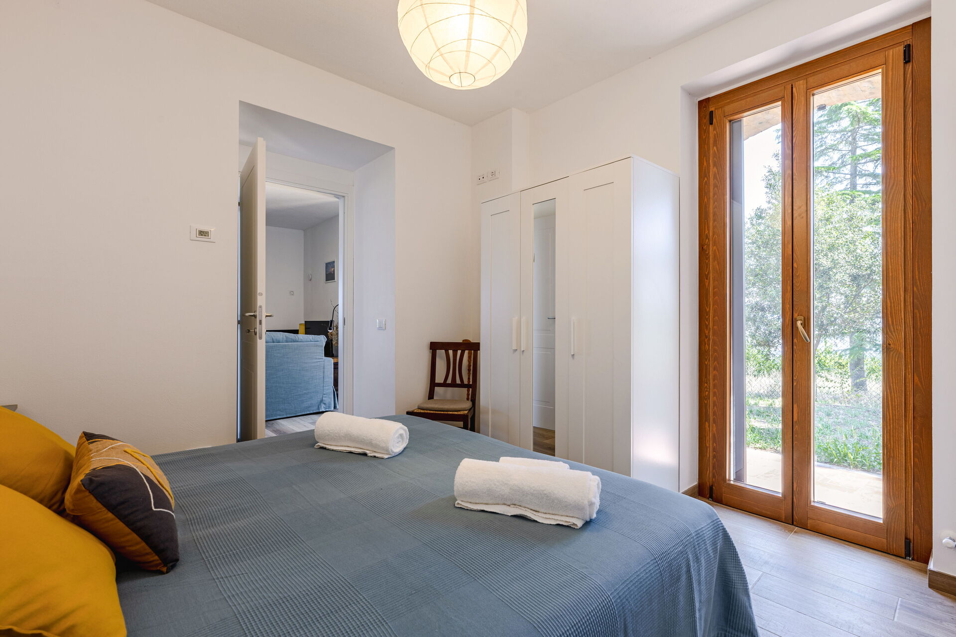 Kitchen + living room: well equipped kitchen, dining table, freezer, stove top, oven, sofa bed double, WIFI internet, satellite tv, exit to the garden, exit to the patio.
