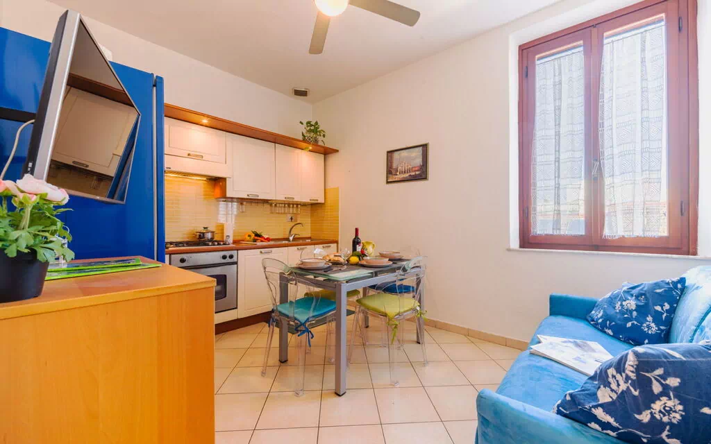 The "appartamento Scirocco" is a 3-room apartment with an area of 60 square meters, situated on the 2nd floor. It offers a very comfortable and cozy furnishing, making it an ideal choice for your vacation. The living/dining room is equipped with a TV (flat screen) and a fan for your convenience. There is one double bedroom with air conditioning, and another room with two beds, also featuring air conditioning. Additionally, there is an exit leading to a small balcony.