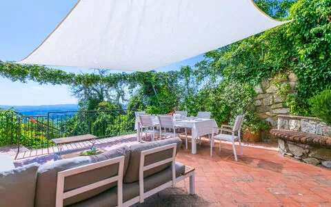 During your vacation stay, you'll have access to various amenities to ensure a comfortable and convenient experience. The property is equipped with air conditioning, heating, and parquet or natural stone floors throughout. Outdoor spaces include a large terrace, partly roofed and west-facing, a patio, and a terrace furnished with patio furniture and a barbecue. Additionally, you'll have access to a box-room for storage. Other amenities include a washing machine, safe, iron, mosquito net, children's high chair, baby cot (suitable for up to 2-year-olds), hair dryer, and logs (at an extra cost). High-speed internet (WiFi) is provided free of charge.