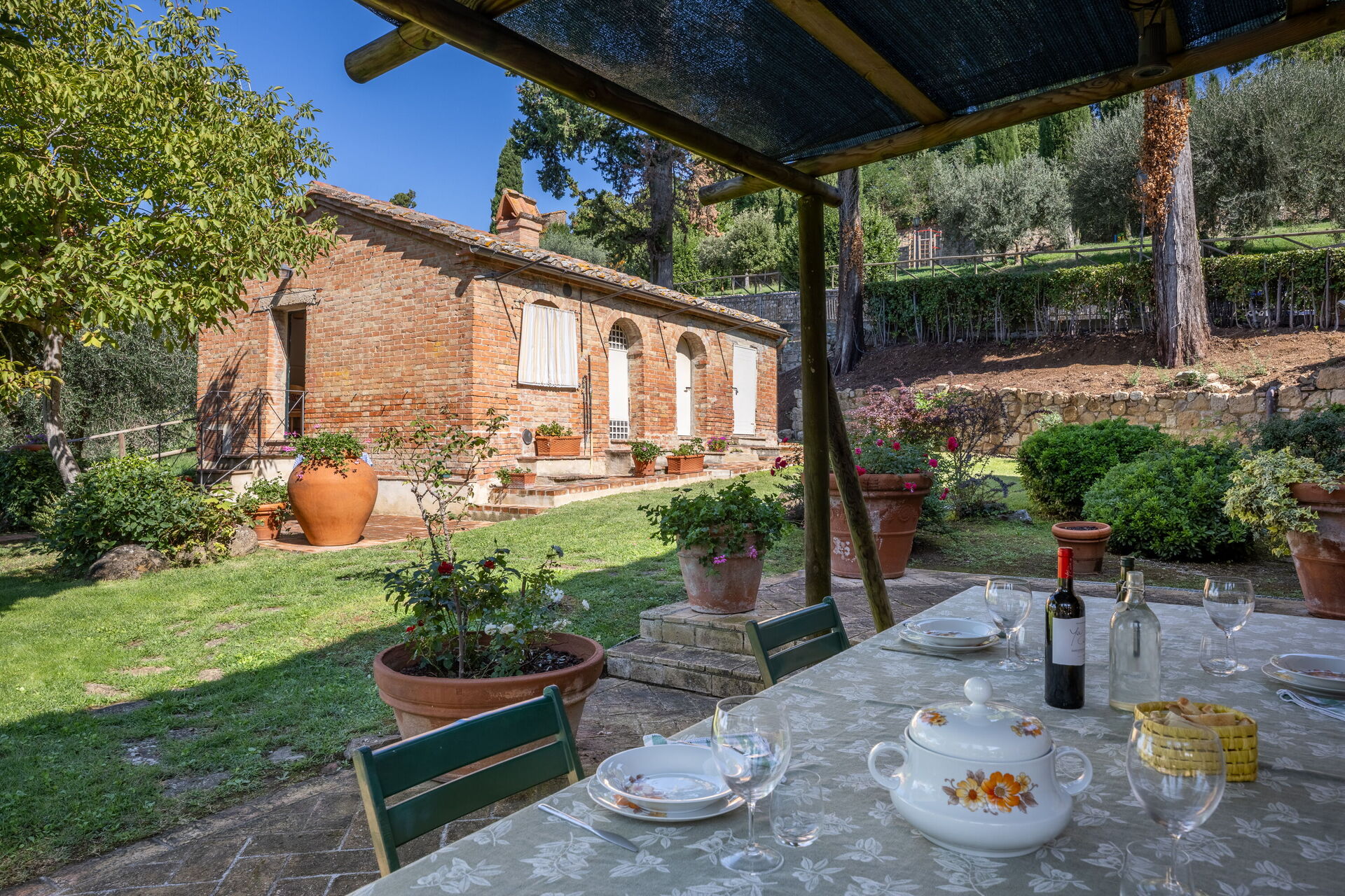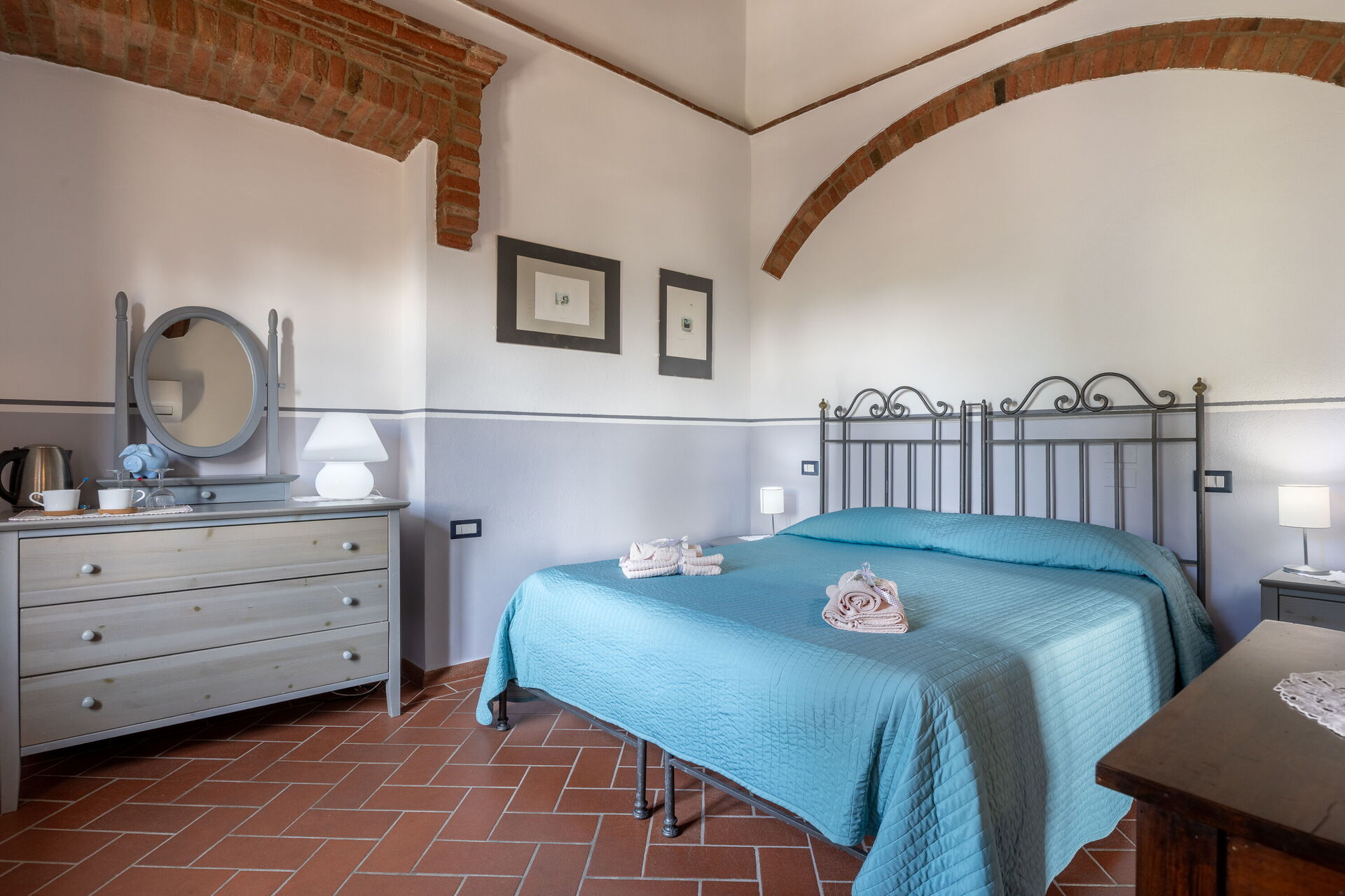 When you arrive you will be greeted by the owner or manager where you’ll find a beautiful clean well-maintained property with views of the hills perfect for a relaxing holiday in Tuscany. For your pleasure you will find a private garden where you can unwind while enjoying a nice cold beverage after a hectic day of shopping. A real benefit of renting a home, instead of multiple hotel rooms, is the ability to relax after a busy day of sightseeing with family and friends. Enjoy a meal together along with some local wine to finish the day. If you enjoy cooking for family and friends there is a well-equipped kitchen including coffee machine, microwave, toaster, stove and refrigerator, as well as, plenty of tableware and cutlery for up to eight people.