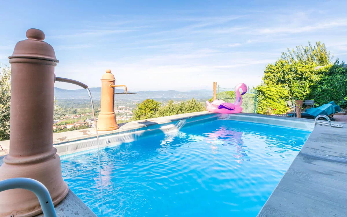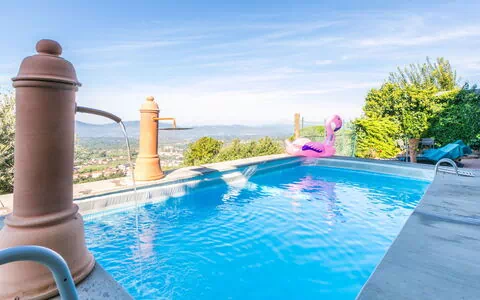 Nestled 450 meters above sea level in Reggello, Italy, this semi-detached country house serves as an ideal vacation rental with modern amenities. The property features a heated swimming pool, complimentary Internet WiFi access, convenient on-premises parking, and proximity to tennis courts. The residence sits atop a hill, offering an elevated countryside position with a serene atmosphere.