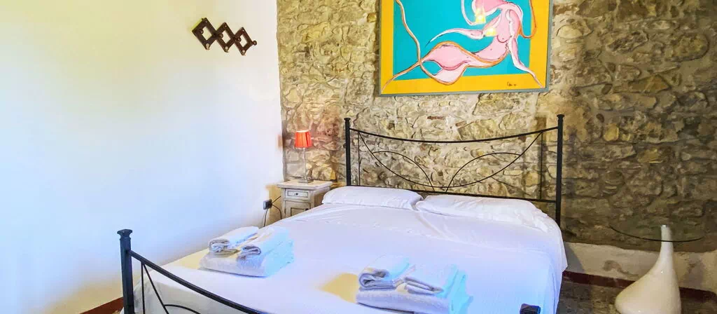 This charming "Casetta de Sodoni" is a two-level, 90-square-meter apartment featuring rustic and tasteful furnishings throughout. On the upper floor, accessible by an open staircase, you will find a living/sleeping room with a sofabed and wood-burning stove, along with two double bedrooms and a shower/WC. The second upper floor houses a fully equipped kitchen with natural stone floors and a balcony exit. The kitchen includes a dining table for your convenience.