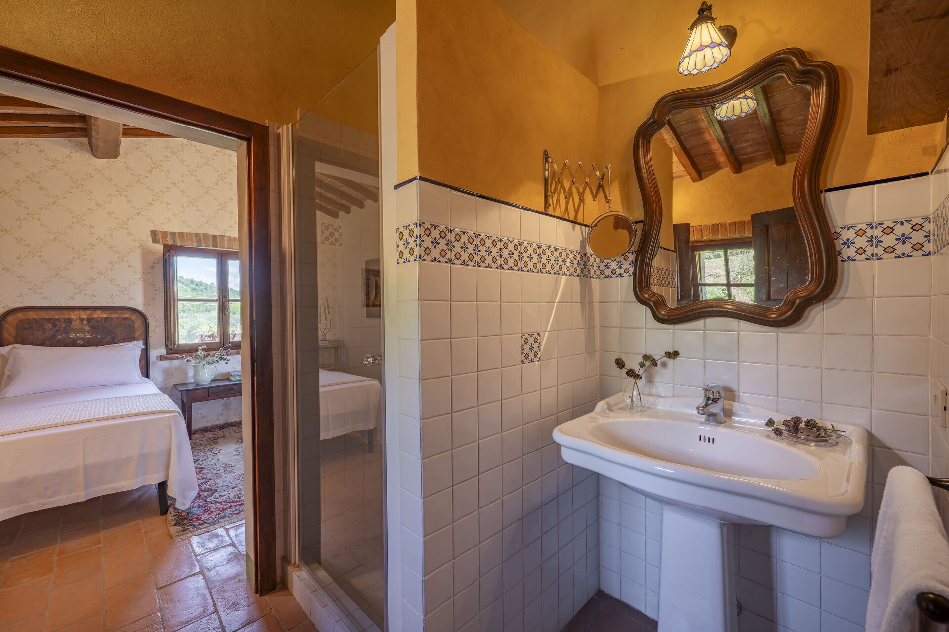 Bedroom + Ensuite Bathroom: french bed, WIFI internet, internet, basin, toilet, shower, exit to the garden.