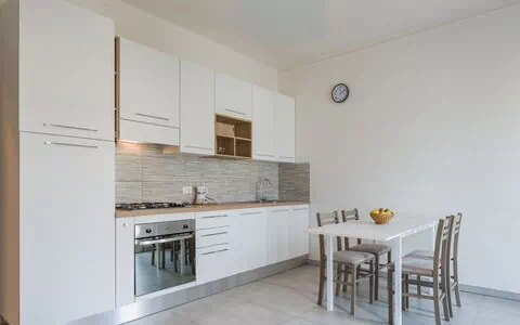 Your vacation rental is equipped with air conditioning throughout the accommodation and heat available only from 01.11. to 07.04., along with gas heating. The property features a washing machine for your convenience, as well as a dishwasher located in the kitchenette. Television (flat screen) is provided in multiple rooms throughout the unit. The kitchenette is fully equipped with an oven, gas stove with 4 gas rings, toaster, kettle, freezer, and electric coffee machine. Additional facilities include an iron, hair dryer, and internet (WiFi, free). The unit is equipped with a smoke alarm and fire extinguisher for your safety.