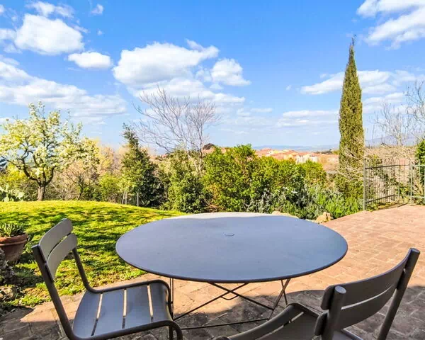 This spacious 8-room villa spans 450 square meters across 2 levels and features tasteful and stylish furnishings throughout. On the main floor, you will find a living room with television that provides exit to the garden and terrace. The ground level includes one double bedroom, one large double bedroom with sloping ceilings that exits to the balcony, and one double bedroom with shower and WC that provides exit to the garden. A large kitchen equipped with 4 gas rings and a pizza oven includes a dining table, and there is also a shower and WC with double hand-basin on this floor. The upper floor features an open large living and dining room with television and wood-burning stove that exits to the terrace. This level also contains a living room, one double bedroom with wood-burning stove, and 2 additional double bedrooms. An open kitchen on the upper floor is equipped with an oven, dishwasher, 5 gas rings, toaster, kettle, and microwave, and provides exit to the terrace. Two showers with WC are also located on the upper floor. The villa offers a balcony, 2 terraces, and a patio with terrace furniture, all providing marvellous panoramic views of the countryside.