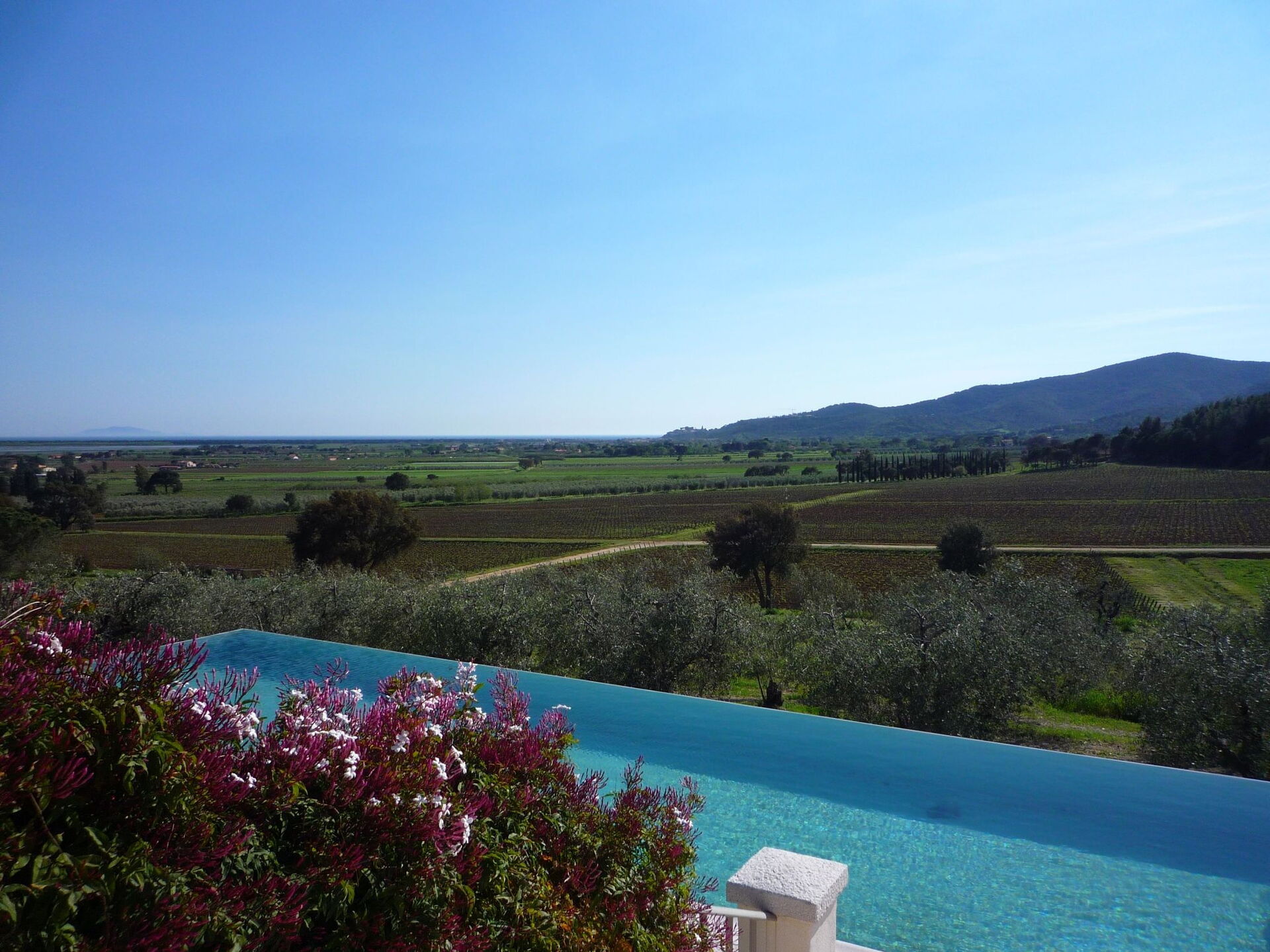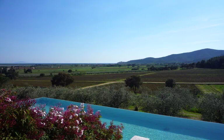 Villa Castelprile is a recently renovated independent villa situated near the beach resort of Castiglione Della Pescaia on the Maremma coast in Italy. This elegant and modern property accommodates up to 14 guests across 7 bedrooms and 8 bathrooms. The villa boasts open views over the countryside and the Tyrrhenian Sea, overlooking the hills and coast towards the peninsula of Argentario, the Natural Reserve of Diaccia Botrona, and Montecristo and Giglio Islands. Surrounded by a lush garden and hectares of vineyards, this property provides an ideal setting for a relaxing holiday. The villa features Internet Wifi to ensure you remain connected throughout your stay. You will find numerous areas throughout the property designed for reading, relaxing, sunbathing and dining, making it a perfect retreat in the southern part of Tuscany.
