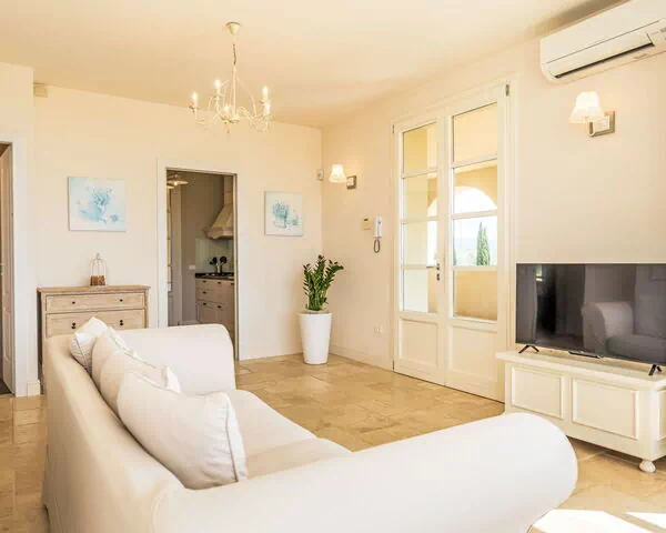 You will find this 3-room villa offers 120 square meters of spacious, comfortable, and tastefully furnished accommodation for your vacation. The living and dining room features a panoramic window, one double sofabed, a dining table, and air conditioning, with direct exit to the veranda. The first bedroom is furnished with one bed and one double bed. The second bedroom also contains one bed and one double bed, with exit to the loggia. The open kitchen is equipped for your culinary needs with a dishwasher, gas stove with 4 gas rings, toaster, kettle, and electric coffee machine. The villa includes a shower, bidet, and WC. You will appreciate the 70 square meter roofed terrace with terrace furniture and box-room, offering beautiful panoramic views of the swimming pool and the countryside.
