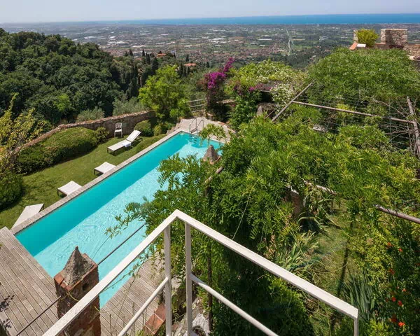 This Tuscan hill villa is ideally positioned atop a medieval hamlet, overlooking the sea and the surrounding countryside. The nearest town offering full services is Camariore, located 3 km away. The sandy beaches of Marina di Pietrasanta are 7 km from the property, while the train station in Pietrasanta is also 7 km away. Pisa Airport is 45 km distant, Florence Airport is 105 km away, the port of Livorno is 60 km, Lucca is 38 km, and Portovenere and the Cinque Terre are approximately 70 km from the villa. Private parking is available 300 meters from the villa, and upon arrival, a dedicated car is provided to transport guests and their luggage directly to the property.