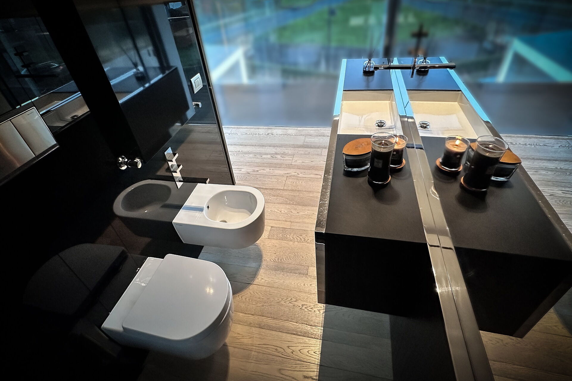 Bathroom: basin, toilet, bidet, shower.