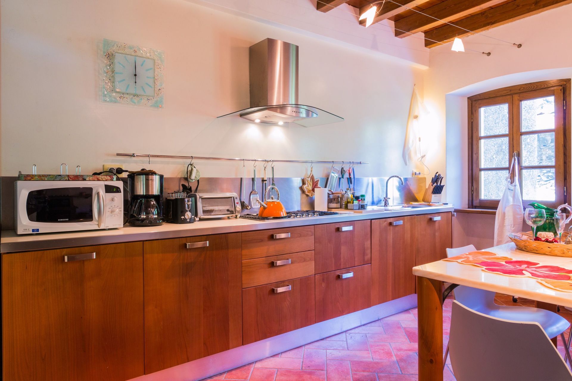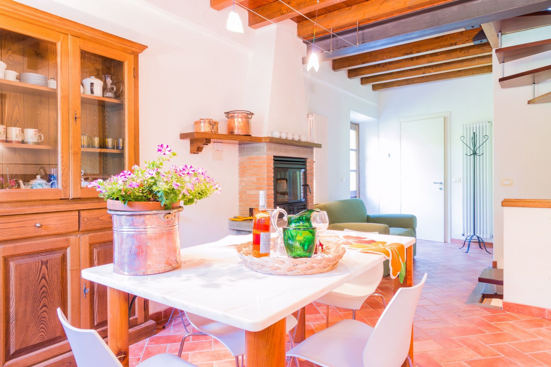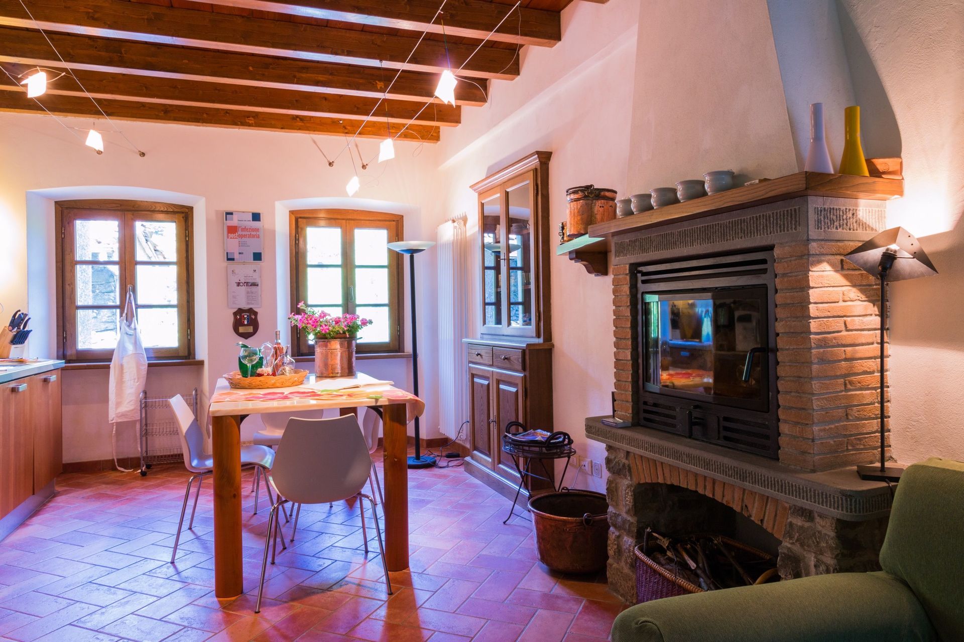The house is fully furnished with all new or antique pieces (Tuscan pieces from the 19th century), except for a wardrobe. The light fixtures are lavish and we have provided a television (satellite), radio and CD player. We have not yet installed a telephone (there is a public phone in town if you don't have a mobile), but telephone, computer, and internet access are available at our office. A central heating system (gas) has also been installed. And, naturally, a working fireplace adorns the second floor, as how would a mountain house be complete without one!