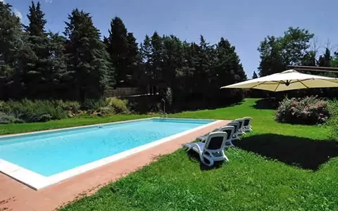 Beautiful farming estate situated on the hills surrounding Florence. This property comprises 3 comfortable apartments. All of the apartments are comfortably furnished in a typical Tuscan style and offer a private furnished outdoor area. The outside areas are very spacious and provide a swimming-pool. The owners of the property run the farming and produce an excellent Chianti wine, olive oil and meat products like ham, salami from a special pig (“Cinta Senese”) typical of the Tuscan area