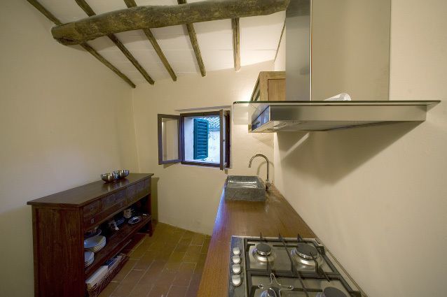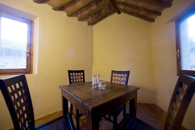 Located on the ground floor it has an independent entrance through a small patio, a kitchen and dining area inside a reconverted old wood oven, the living area and two double rooms. The kitchen has a gas cooker, fridge and microwave, oven and washing machine. The bedrooms have a nice view on the cultivated fields. Bathroom with shower, stone basin and wooden/glass elements. Central heating.