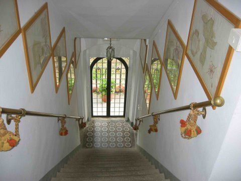 From the entrance, lying across the Italian garden, you walk to the main entrance and a set of stone stairs leading up to the first floor, where the four rooms are located.