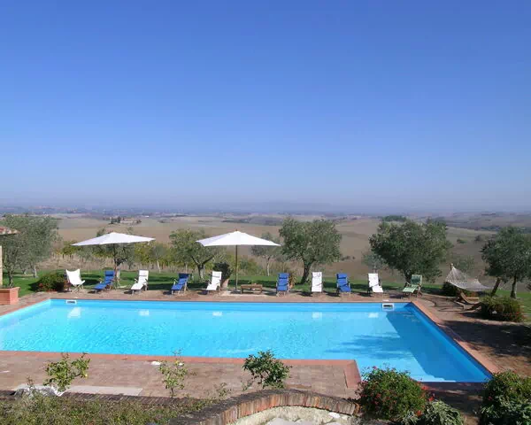 Spacious and beautiful farmhouse with outbuilding and private swimming-pool situated in peaceful location on a large estate enjoying extensive views over the “Crete Senesi” area and Siena in the distance.