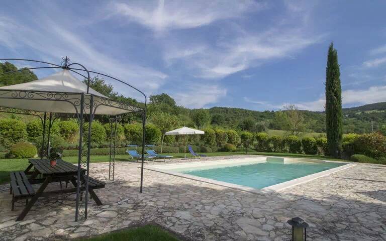 The outdoor spaces of "Sunflower" are thoughtfully designed to make the most of the stunning natural surroundings. The private enclosed swimming pool, measuring 12 x 6 metres with a depth of 120 to 180 centimetres, is maintained by the owner and gardener and is available from 16 May to 30 September. An outdoor shower is conveniently located nearby for use after a swim. The beautiful garden features a large porch with a stone table, a gazebo, a pergola, and a dedicated patio with a volleyball court, providing a variety of spaces for outdoor leisure and dining. Garden furniture and a barbecue are available for guests to enjoy al fresco meals in a relaxed atmosphere. A children's playground ensures that younger guests are well catered for. The property is further enriched by a wooden log cabin and a large wooden oven, adding to the rustic charm of the estate. The entire farmhouse is surrounded by 2 hectares of grounds, including an orchard, olive groves, and vineyards, creating a serene and picturesque environment.
