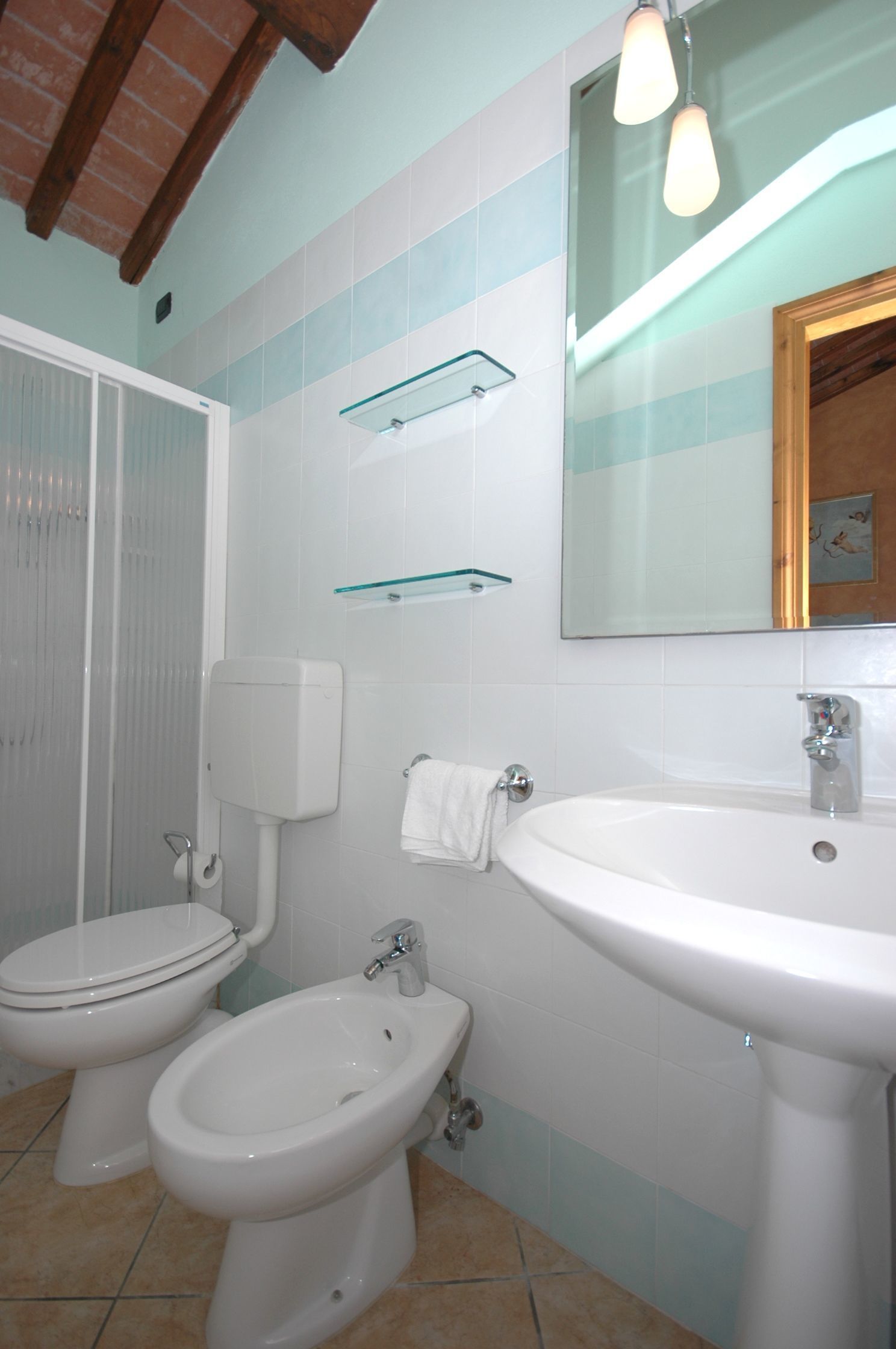 Mezzanine ground floor (access via 4 steps): living-room (satellite TV) with sofa (for 2 persons), dining area and kitchen corner (oven, freezer), double bedroom with ensuite bathroom with shower, twin-bedded room with ensuite bathroom with shower.
