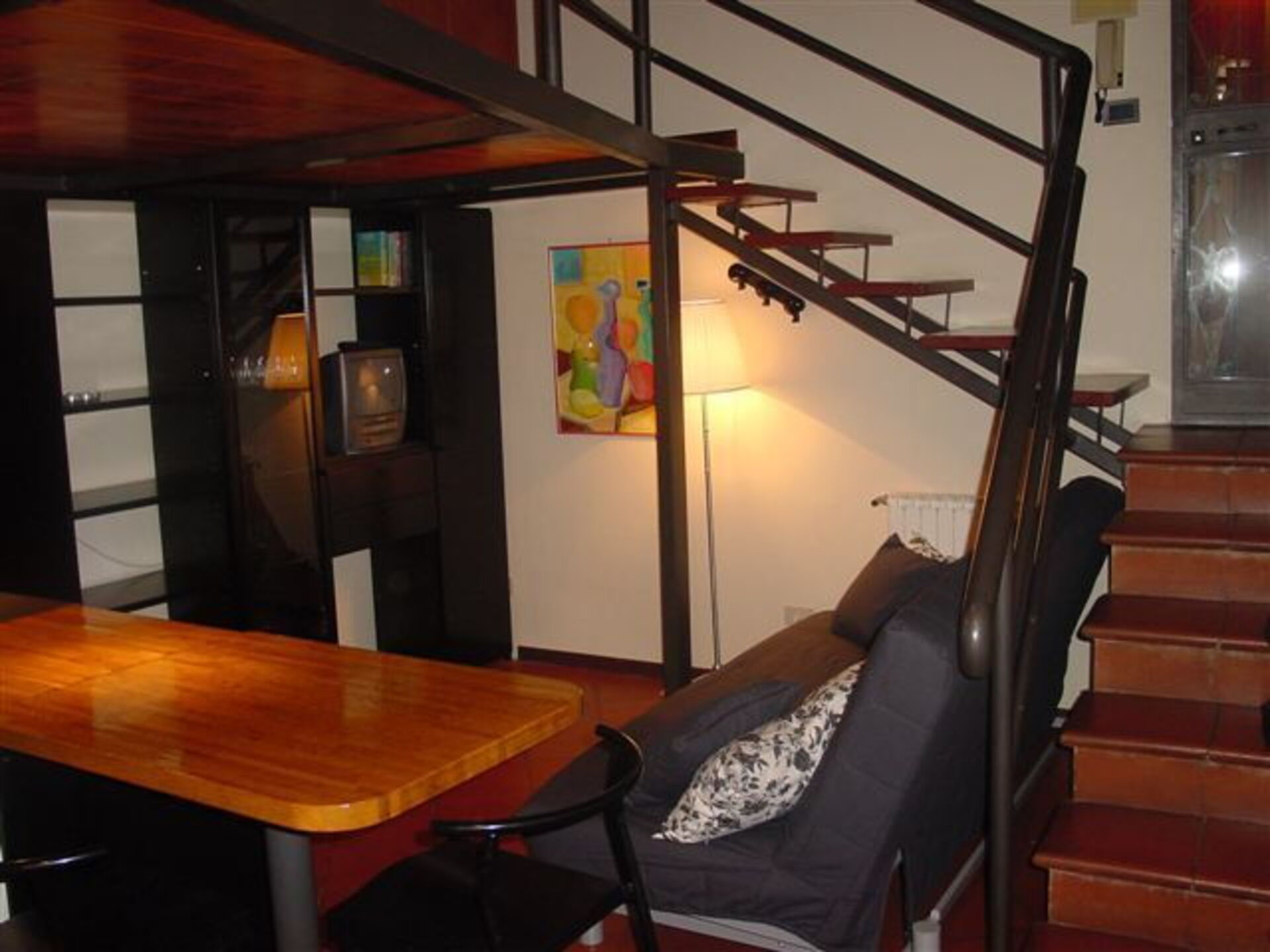 The apartment has a living room with a sofa, and a large library and a TV set. The kitchenette is fully equipped with dishwasher, microwave , electric oven, washing machine and a toaster. From a wooden stair there is access to the open mezzanine where there is a queen size bed, and a large closet. Some typical paintings are fixed on the walls. The small bathroom has a shower and window. Internet is available on request.