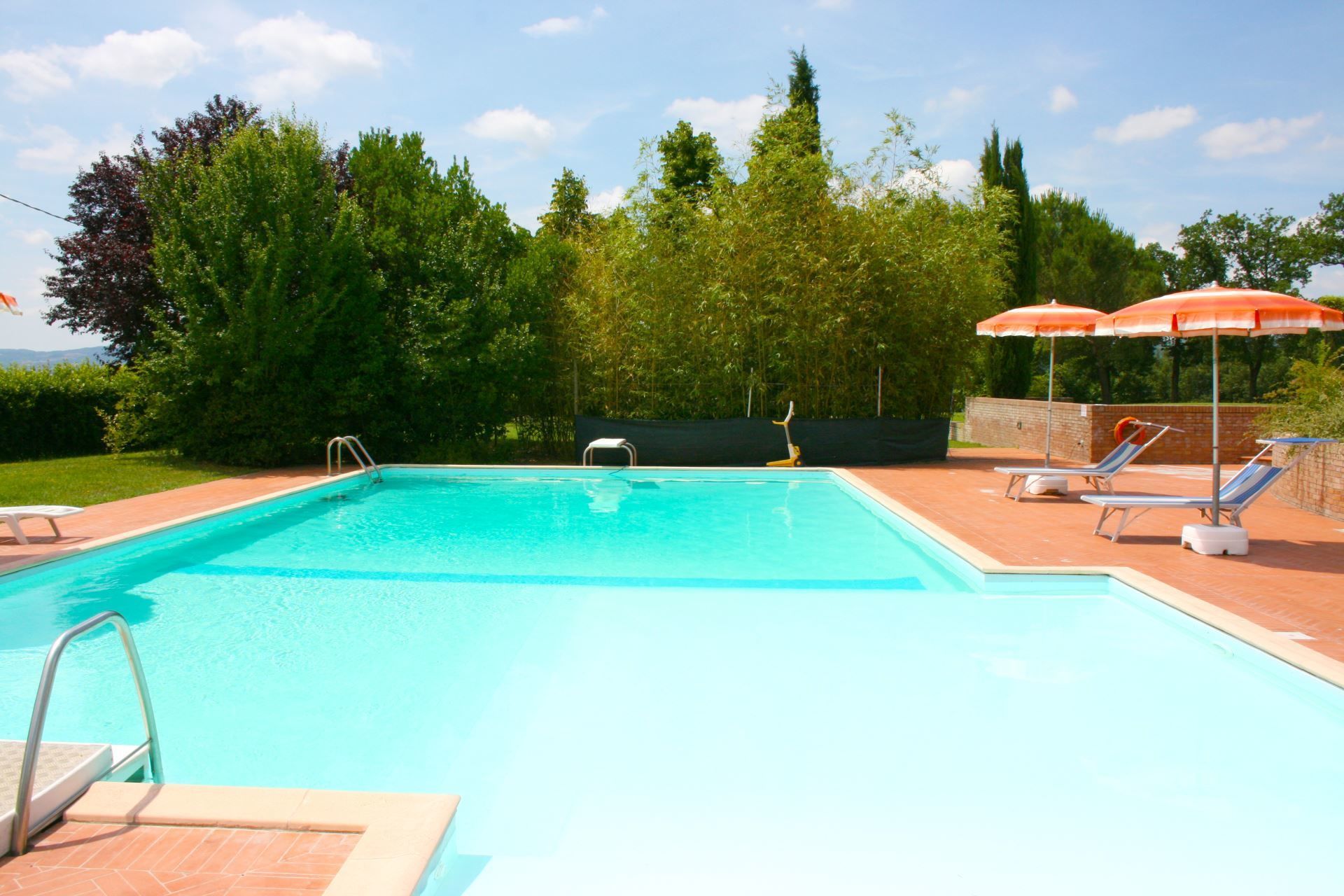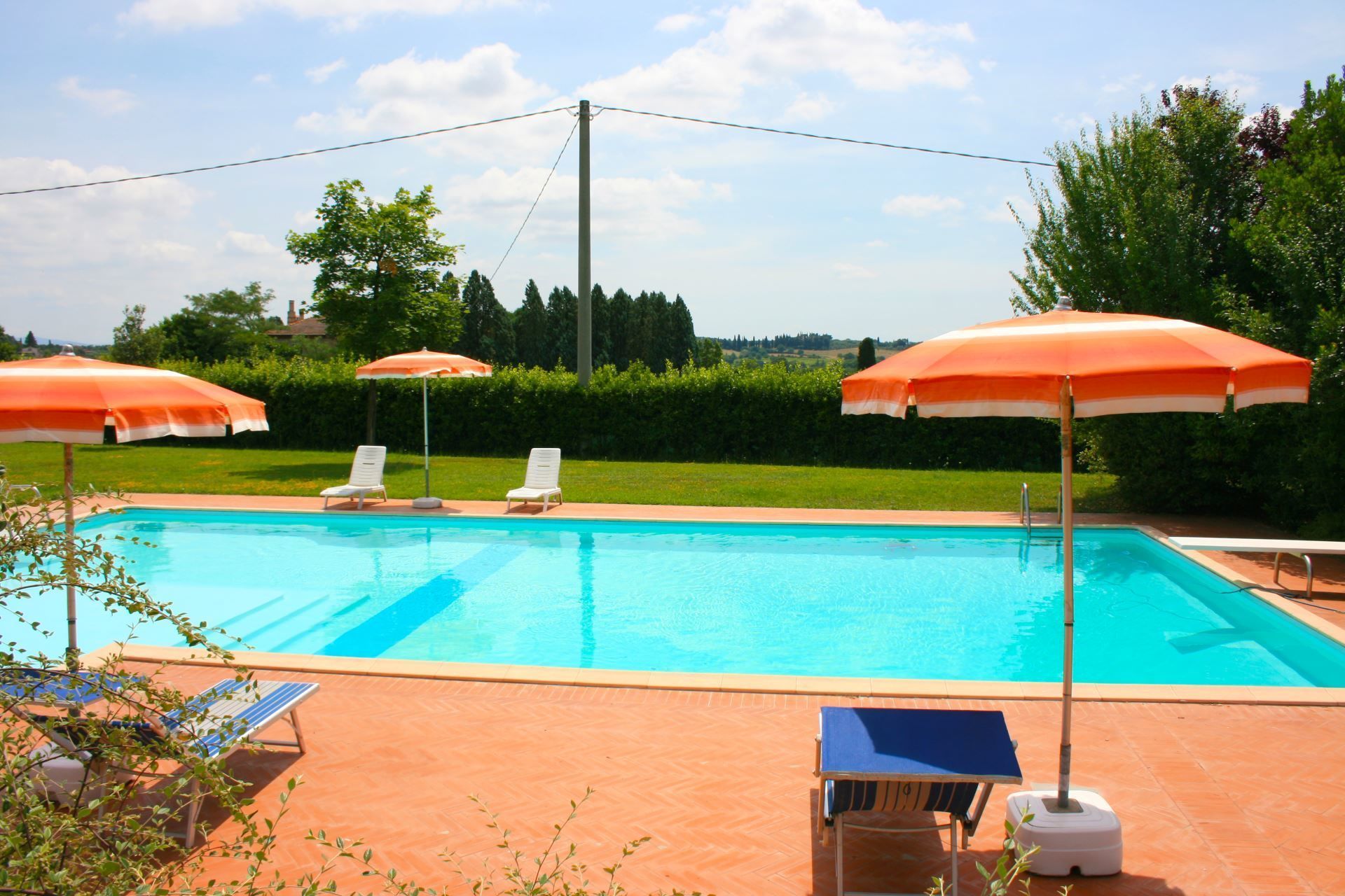 Around the farmhouse you will find a large green area shaded by olive trees, pines, cypresses and oaks and where you will find, for your exclusive use, a beautiful large swimming pool (size m. 7x14, depth m. 0.50-2.60 - open from 01st May to 19 September) where you will spend your hot summer days.