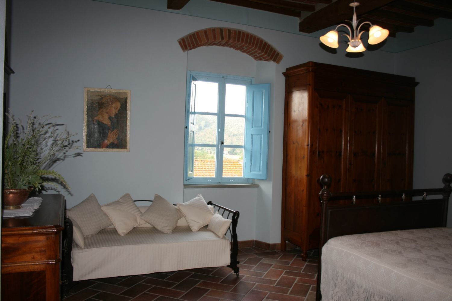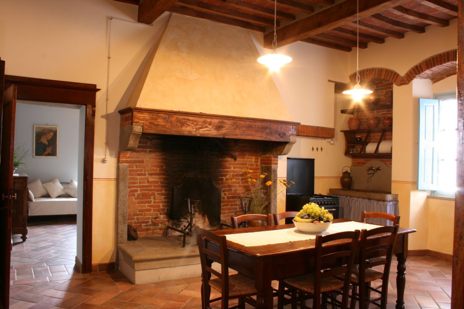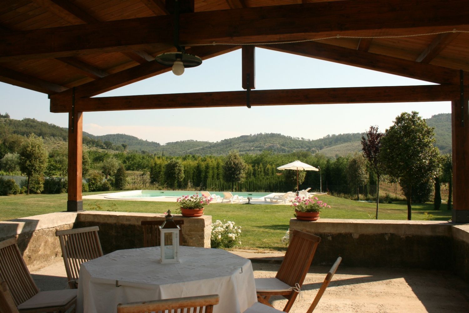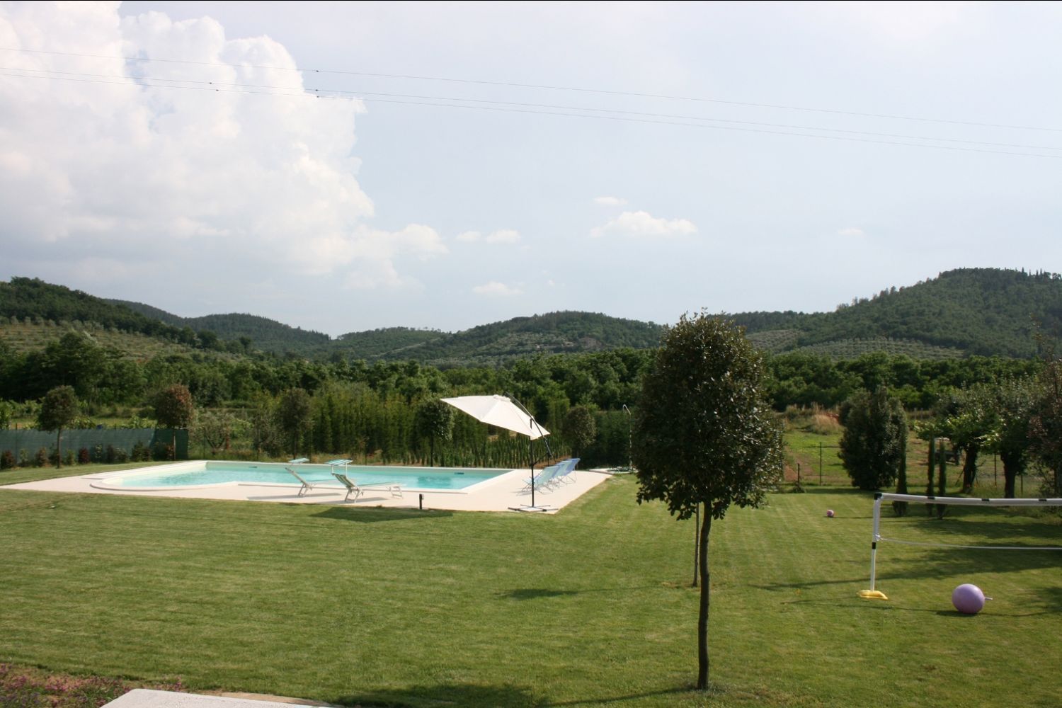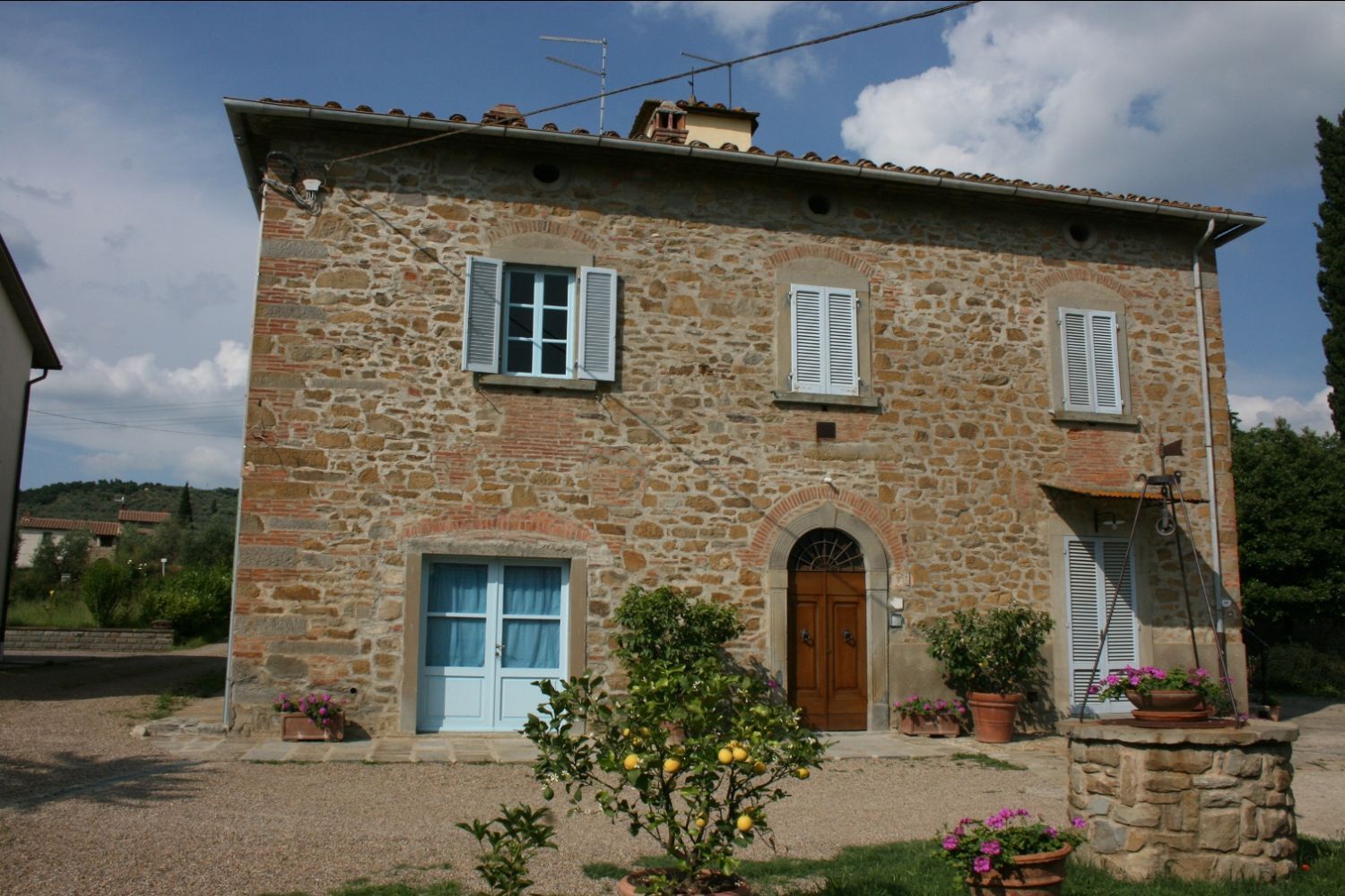 The area around Castiglion Fiorentino includes all the characteristics of the typical Tuscan landscapes. The countryside down in the valley, with endless stretches of nurseries with house plants, fruit and vegetables and flowers alternating with cultivated fields of wheat, corn and sunflowers, merges harmoniously with the high hills where villas and old farmhouses stand surrounded by vineyards and olive groves. Higher up where it is more difficult to cultivate the land, the hills are covered in cool oaks, chestnuts and fir woods. The Agriturismo Scacciapensieri is only a part of an old farmhouse, which thanks to a careful renovation has been given new life and awaits those who wish to spend their holidays in this area. Near the house there is a large garden with a gazebo equipped for eating outside, a barbecue and a beautiful swimming pool (6x12m. - depth 1.40 - 2.20m) exclusively for guests' use, from which one can admire the view of the ancient Castle of Montecchio. Bicycles, satellite TV and DVD player are available for guests' use.It has been well furnished and the internal use of materials is typical of old Tuscan farmhouses. On guests' request the owner can prepare typical Tuscan lunches and dinners.