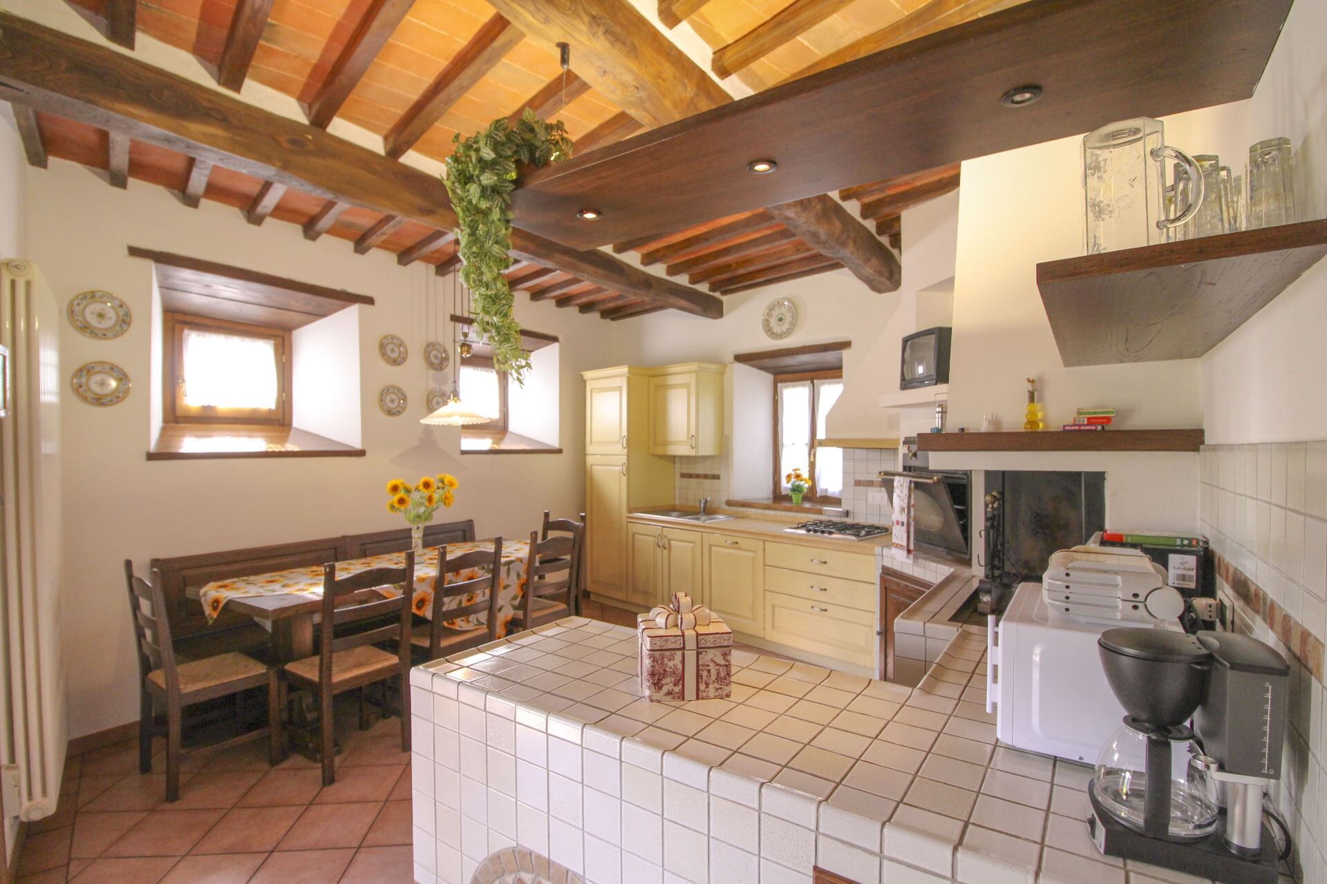Fridge with freezer compartment, oven, dishwasher, lemon squeezer, filter coffee maker, microwave, toaster, wood burning oven, espresso coffee maker, barbecue