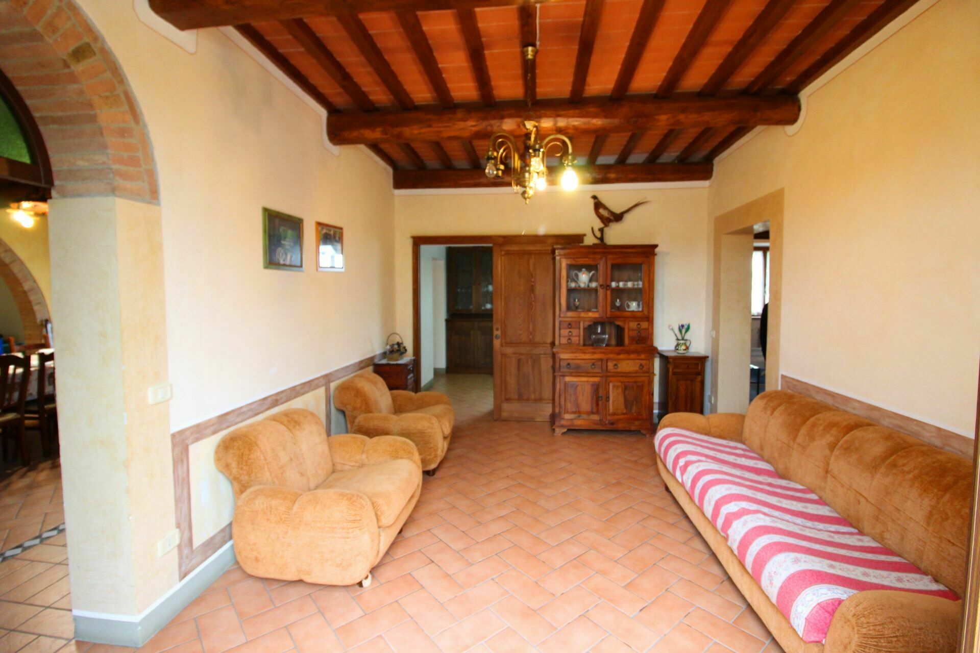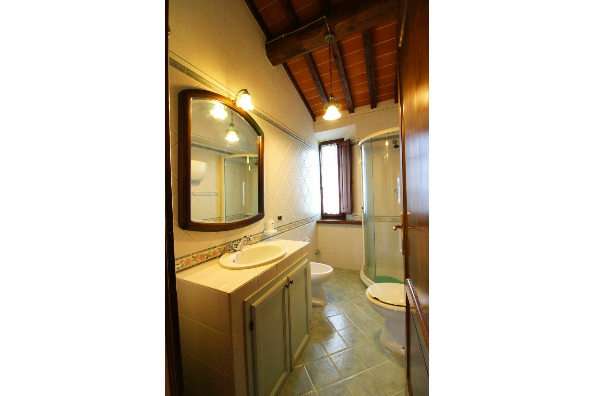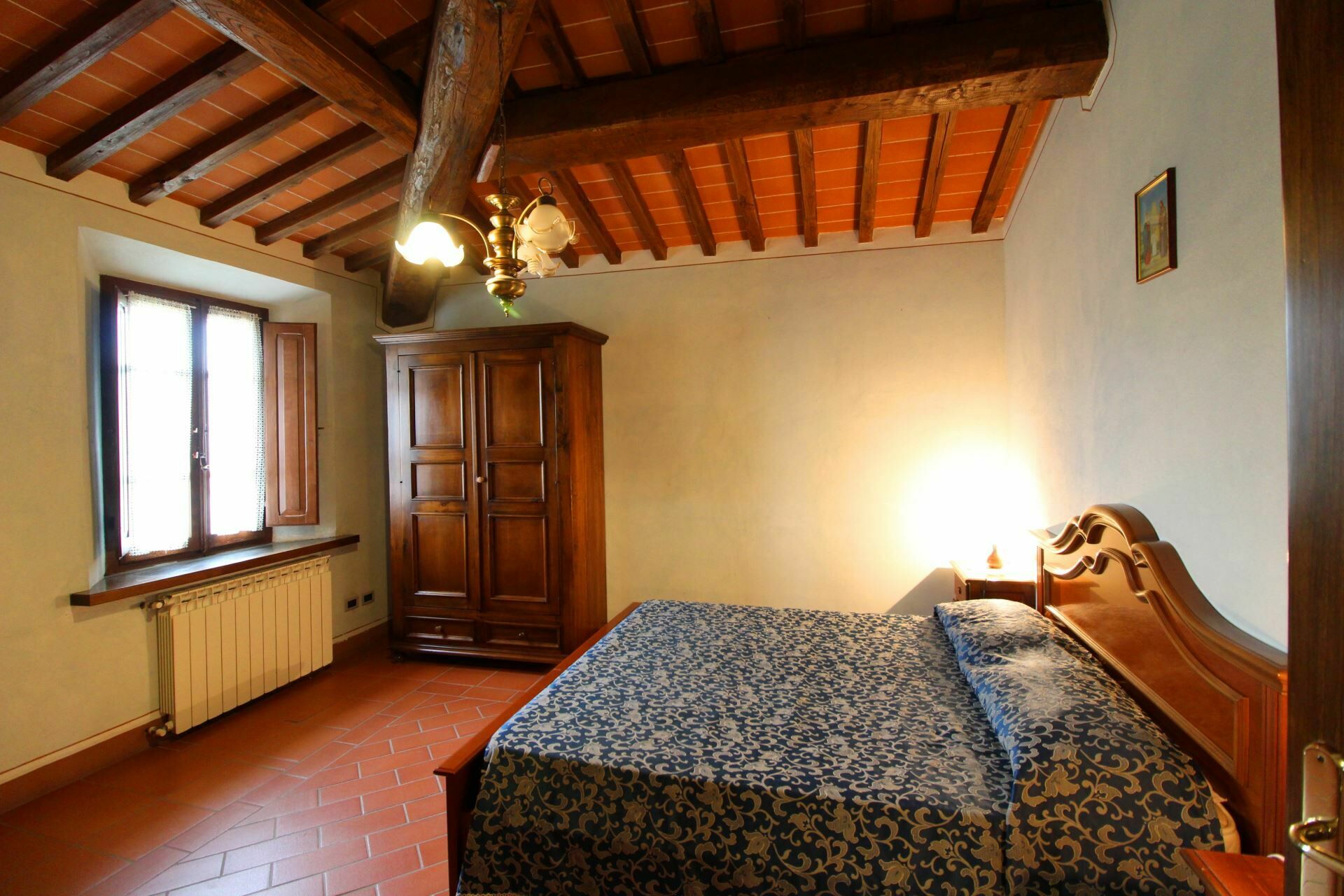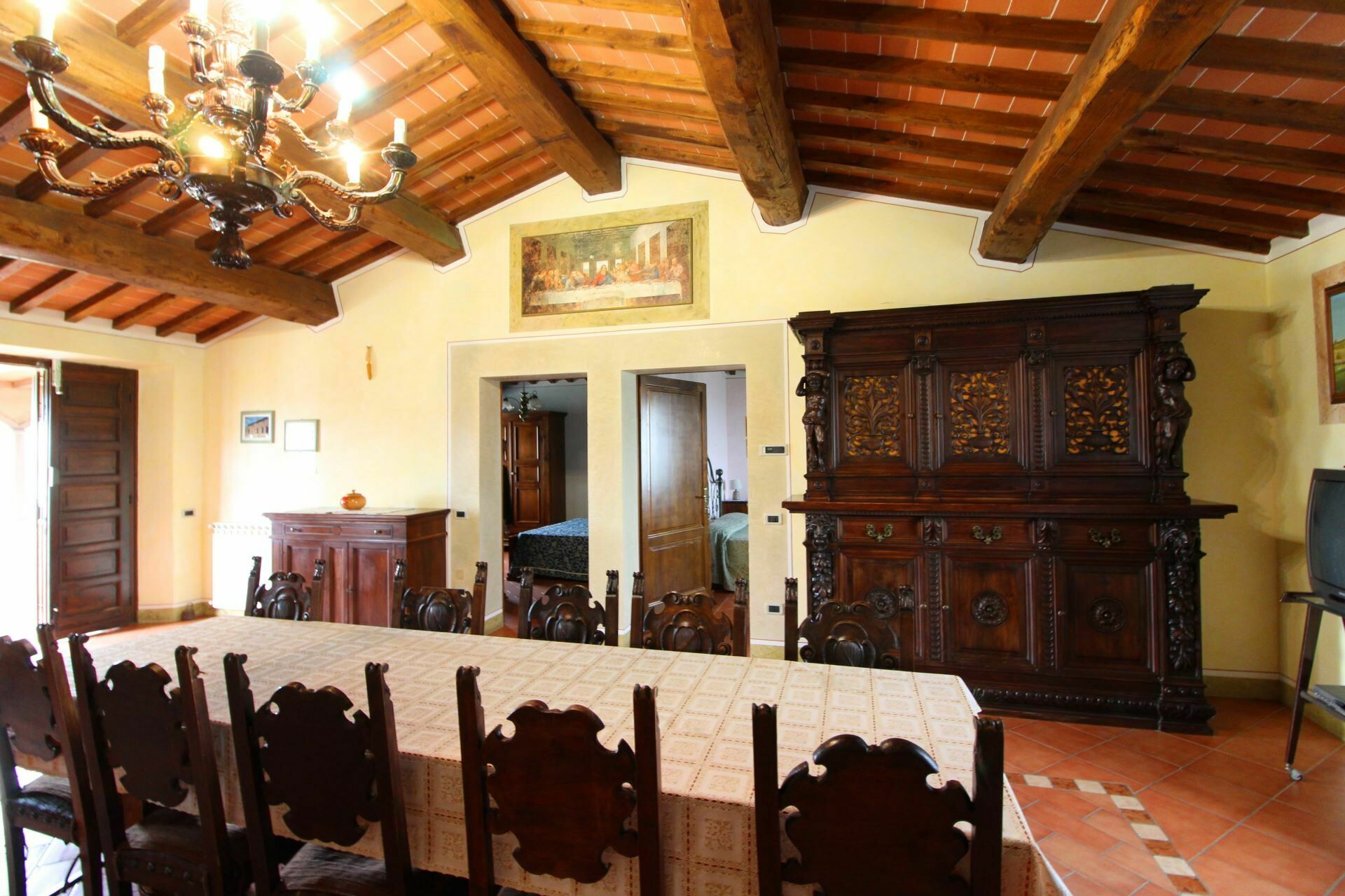 FIRST FLOOR: entrance from external stone staircase with panoramic loggia. Spacious living room with large open fireplace, four double bedrooms, one bedroom with double bed and single sofa bed, two bathrooms with shower.